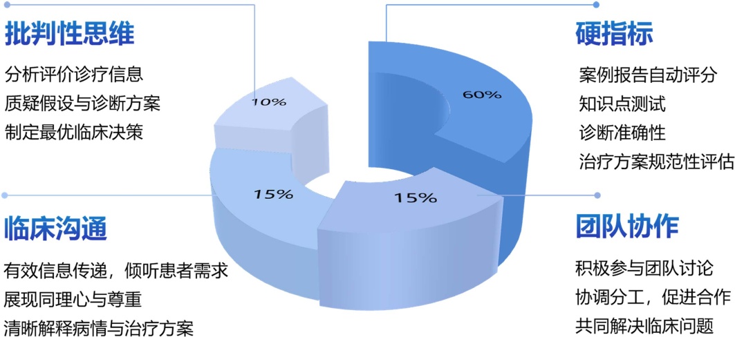 硬指标占比60%,包括AI自动评分的案例报告,重点评估诊断依据的准确性及治疗方案的规范性,同时匹配相关题库进行知识点测试,极大提升评分效率并显著节省教师批改时间,数据来源涵盖AI案例生成器与在线测试系统。