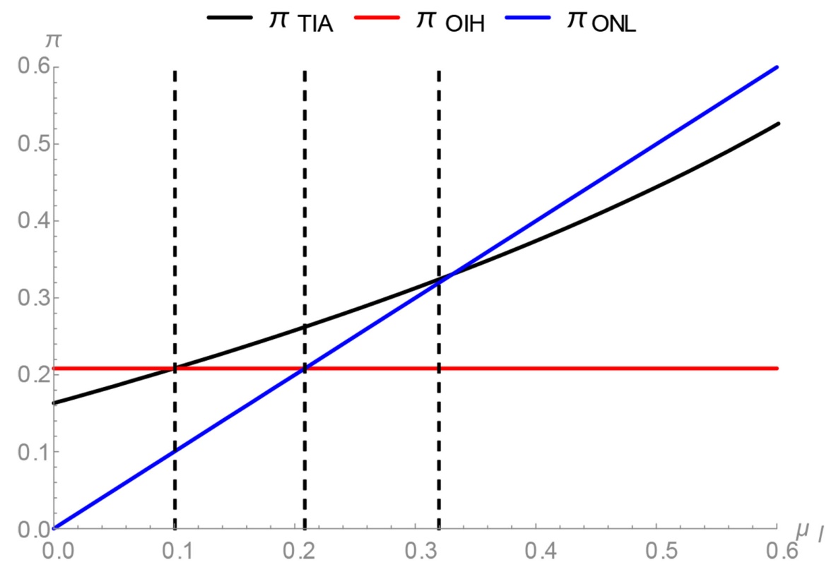 ),当退货处理成本较小且产品线引入成本系数较小时,企业会选择TIA策略;当退货处理成本较小且产品线引入成本系数较大或退货处理成本较大时,企业会选择ONL策略。