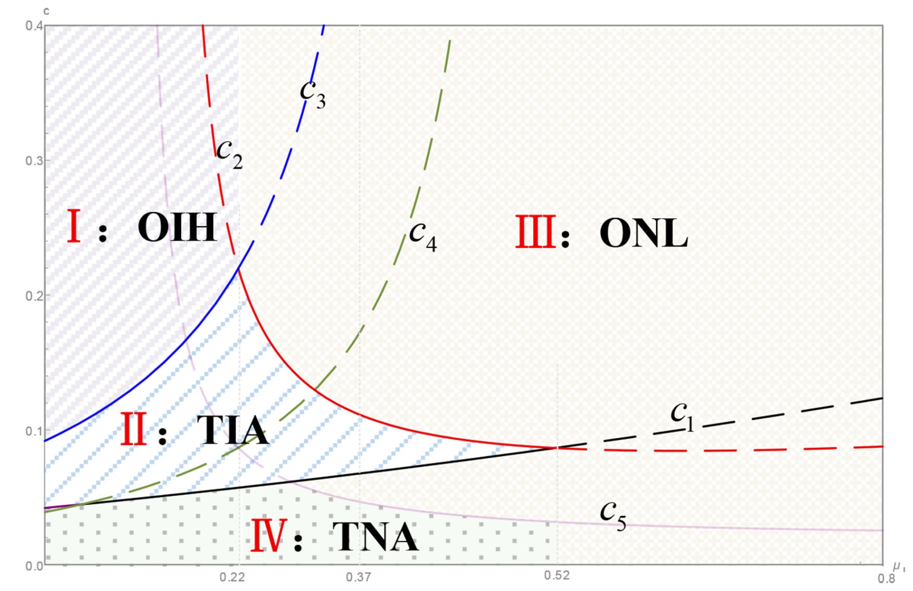 图4描述了企业的策略选择边界。区域I中OIH为企业的最优决策。此时低类型消费者支付意愿极弱,即便引入产品线,低质量产品的收益也难以覆盖成本;同时高引入成本进一步压缩了产品线的盈利空间,因此企业放弃引入产品线。而通过OIH策略聚焦高类型知情消费者,既规避低类型消费者的退货风险,又避免高成本的产品线投入。区域II的最优策略为TIA策略。此时产品线引入成本可控,且低类型消费者感知系数适中,高质量产品可获取高类型消费者的溢价收益,低质量产品可承接低类型消费者的基础需求,产品线的客群细分价值凸显,同时诱导学习可减少错配退货,进一步放大产品线的收益空间。区域Ⅲ的最优策略为ONL策略,此时低类型消费者支付意愿强,已成为核心收益来源,规模效应带来的收益远超产品线引入的增量;同时中高引入成本进一步削弱了产品线的性价比,因此企业放弃引入产品线。区域Ⅳ的最优策略是TIA策略,此时产品线引入成本可忽略不计,即便低类型消费者感知系数低,企业也能通过将部分高质量产品定向销售给高类型消费者、低质量产品定向销售给低类型消费者的自然分流,获取额外收益。