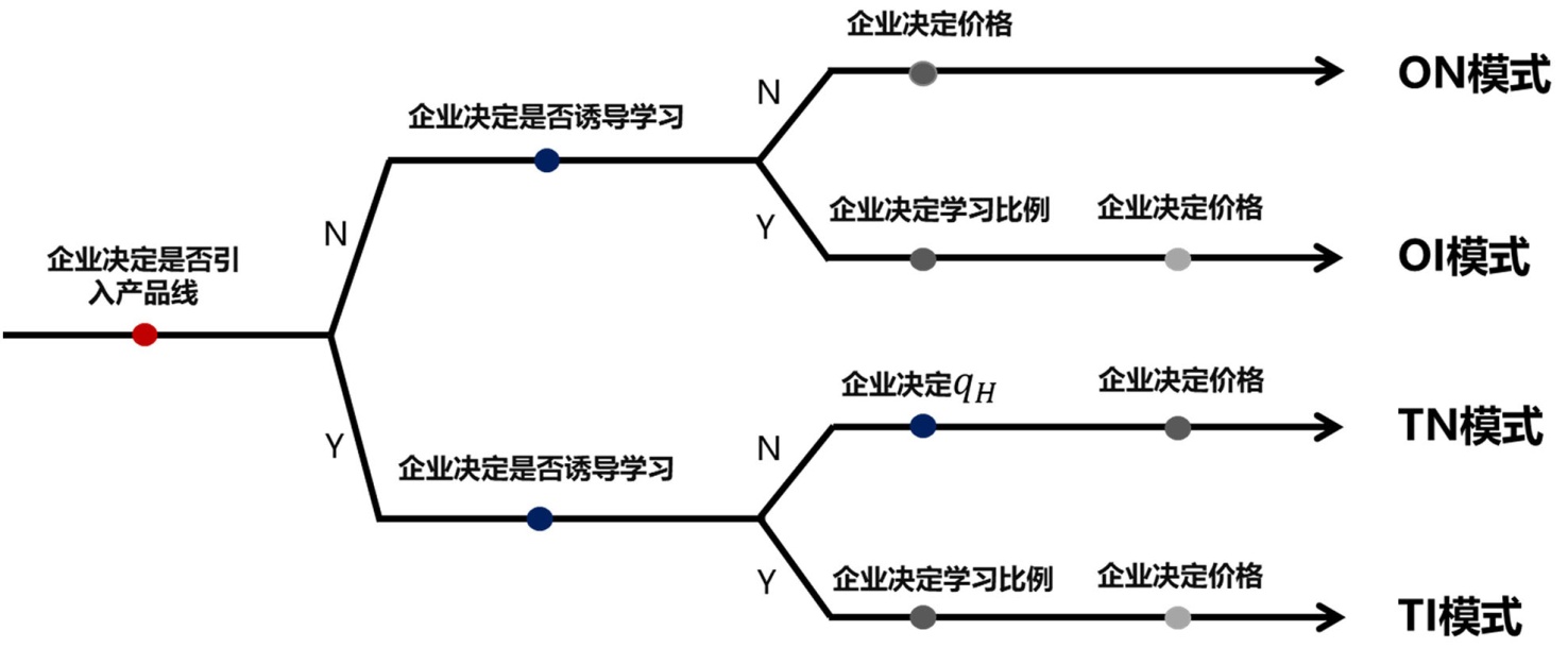 相对于诱导学习,是否引入产品线是企业的长期决策,因为产品线关乎着产品质量的确定。同时,在苹果、华为等品牌的新产品发布前,企业通常会借助媒体等方式吸引消费者,而后才在发布会上公布产品价格。因此,在博弈初期,企业首先需要决定是否引入产品线,之后决定是否诱导学习,在不引入产品线且无诱导学习的情形下(One Product and No Induced Learning,简称ON模式),企业预见到消费者将根据产品价格推测产品价值,决策相应的价格;在不引入产品线且诱导学习的情形下(One Product and Induced Learning,简称OI模式),企业需依次决策诱导学习比例与产品价格;在引入产品线且无诱导学习的情形下(Two Products and No Induced Learning,简称TN模式),企业决策低质量产品质量以及产品价格;在引入产品线且诱导学习的情形下(Two Products and Induced Learning,简称TI模式),企业首先决策低质量产品质量,然后依次决策诱导学习比例和产品价格。对于不知情消费者,他们购买前依据对产品价值的估值与产品价格,决定是否购买或购买哪种产品,购买后得知产品的真实价值,决定是否退货;对于知情消费者,他们依据产品价值与产品价格,决定是否购买或购买哪种产品。博弈时序图如图1。