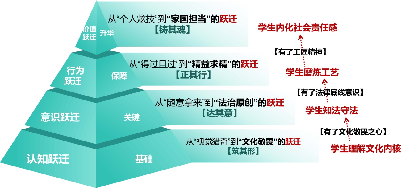 针对伦理意识淡薄问题,学生要从随意拿来转变为法治原创,设计出“意识跃迁”模型。