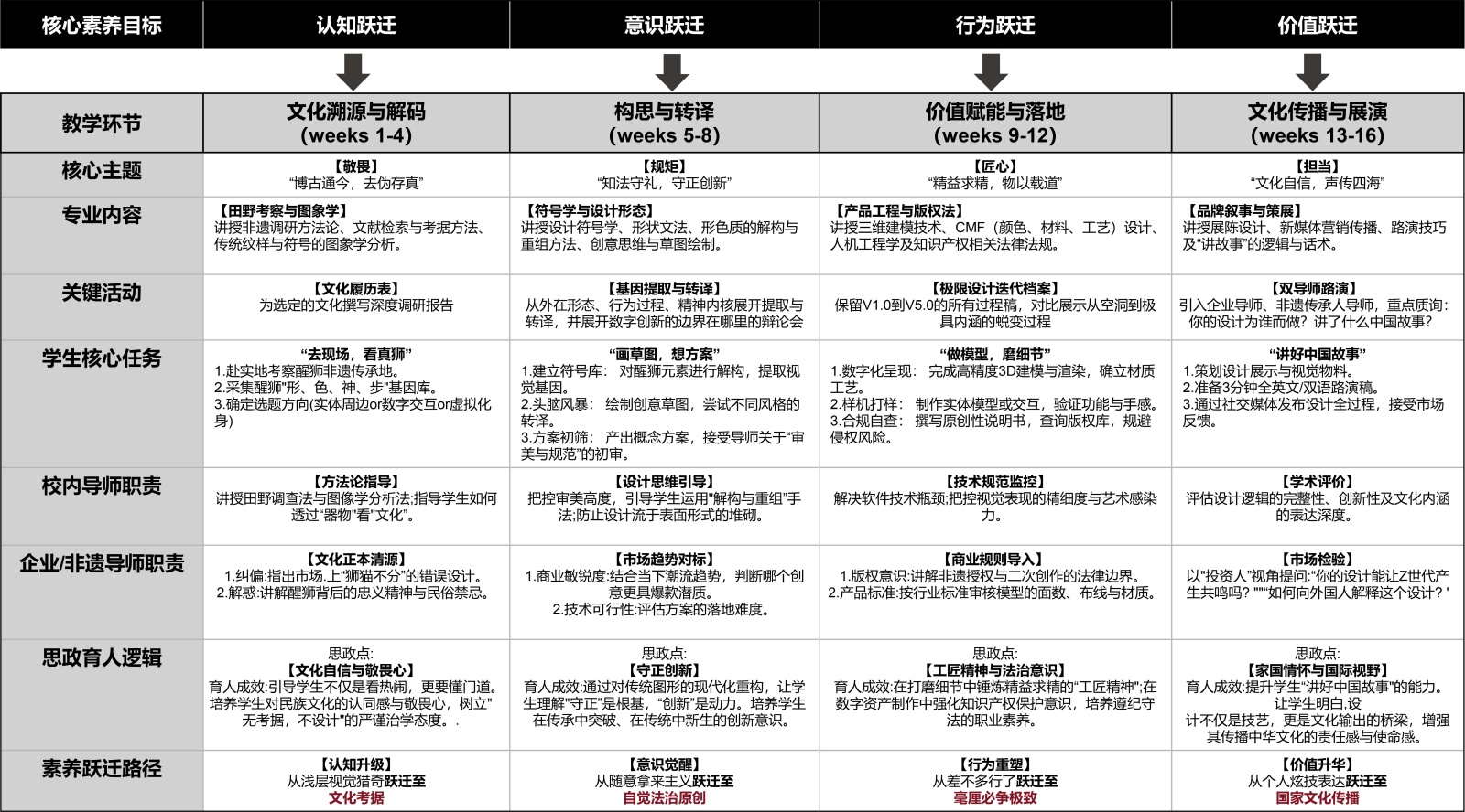 “素养跃迁”是本文构建并实施的《文创产品设计》课程思政教学模式,借助“认知升级–意识觉醒–行为重塑–价值升华”四阶递进式模型,形成了破解专业技能传授与价值观念引领之间双重壁垒的模式构想,以PBL项目驱动以及全过程增值评价作为依托,说明该模式可以在很大程度上避免传统设计教学存在的片面性,还可引导学生在文化活化实战中深入理解“守正创新”的时代内涵,达成了从技术工匠到有家国情怀的文化传承者的根本性转变。