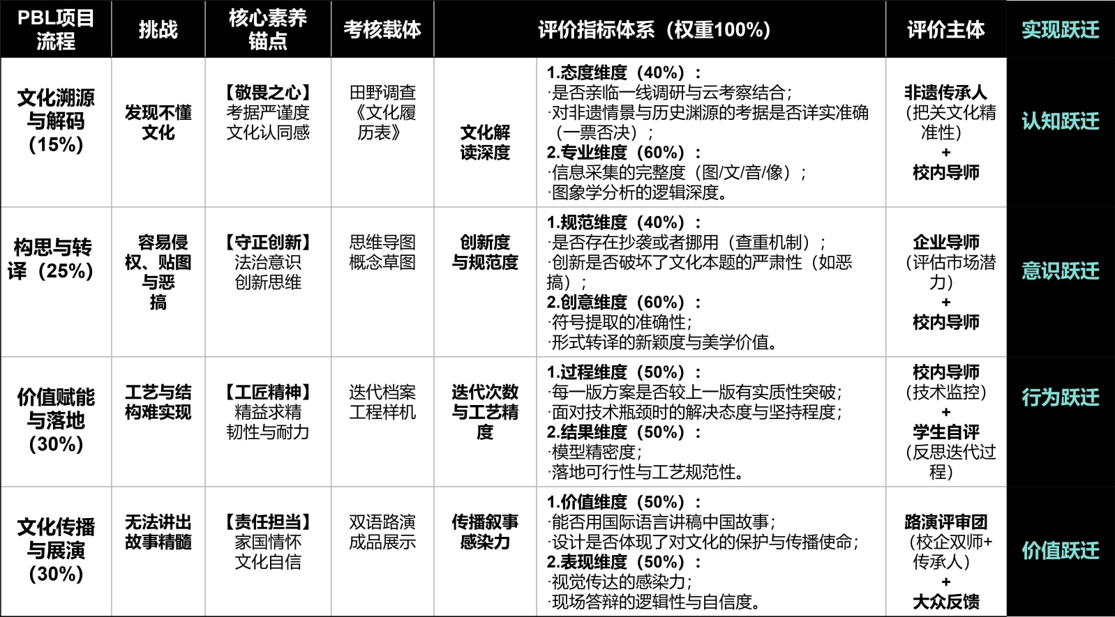 1) 依照PBL项目推进的逻辑,重新制定考核体系:将考核体系重构为认知、意识、行为、价值这四个核心维度,在认知维度(权重为15%)依托《文化履历表》,对学生文化解读的程度展开考核,着重考查学生田野调研的真实性以及对非遗历史渊源考据的严谨程度;在意识维度(权重是25%)以概念草图作为切入点,对创新性、规范度进行考核,借助查重机制检测文化基因转译的法律边界,防止抄袭与恶搞,保证守正创新;行为维度(权重为30%),主要以方案迭代档案与样机制作为考察依据,考核方案迭代的次数以及工艺精度,关注方案从构思到落地的实质性突破过程,量化学生面对技术瓶颈时的工匠精神;价值维度(权重为30%),主要考核传播叙事的感染力,重点评估学生讲好“中国故事”的能力以及作品所承载的文化传播使命。这一体系将隐性的思政素养转变为可视、可测的考核数据,保证了四层级跃迁的闭环得以落地。