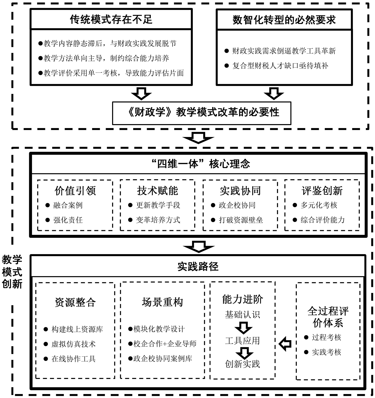 基于此,本文以“数智驱动”为核心,分析《财政学》教学模式改革的必要性,吸收上述理论精髓,并尝试在价值引领维度拓展、政企校协同生态构建,以及虚实场景融通等方面进行整合与突破,探索《财政学》教学模式系统性改革的理念、实施路径。通过教学模式的创新,旨在培养出既具备扎实财政学理论基础,又熟练掌握数智技术应用能力,且拥有良好职业道德和创新精神的高素质财政专业人才,以适应新时代财政领域不断发展变化的需求。本文所构建的教学模式,基于作者在《财政学》课程中的教学实践与反思,融合了已实施的改革举措与对未来教学的设想,旨在系统推进教学体系的数智化转型。
