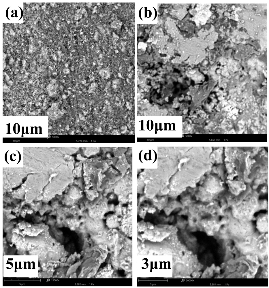 采用扫描电子显微镜对复合材料的微观形貌进行观察。测试前,样品经充分干燥后,使用玛瑙研钵研磨均匀。取少量粉末置于导电胶表面,以洗耳球吹除多余样品,随后进行喷金处理以提高导电性,最后将样品置于样品台中进行观测。