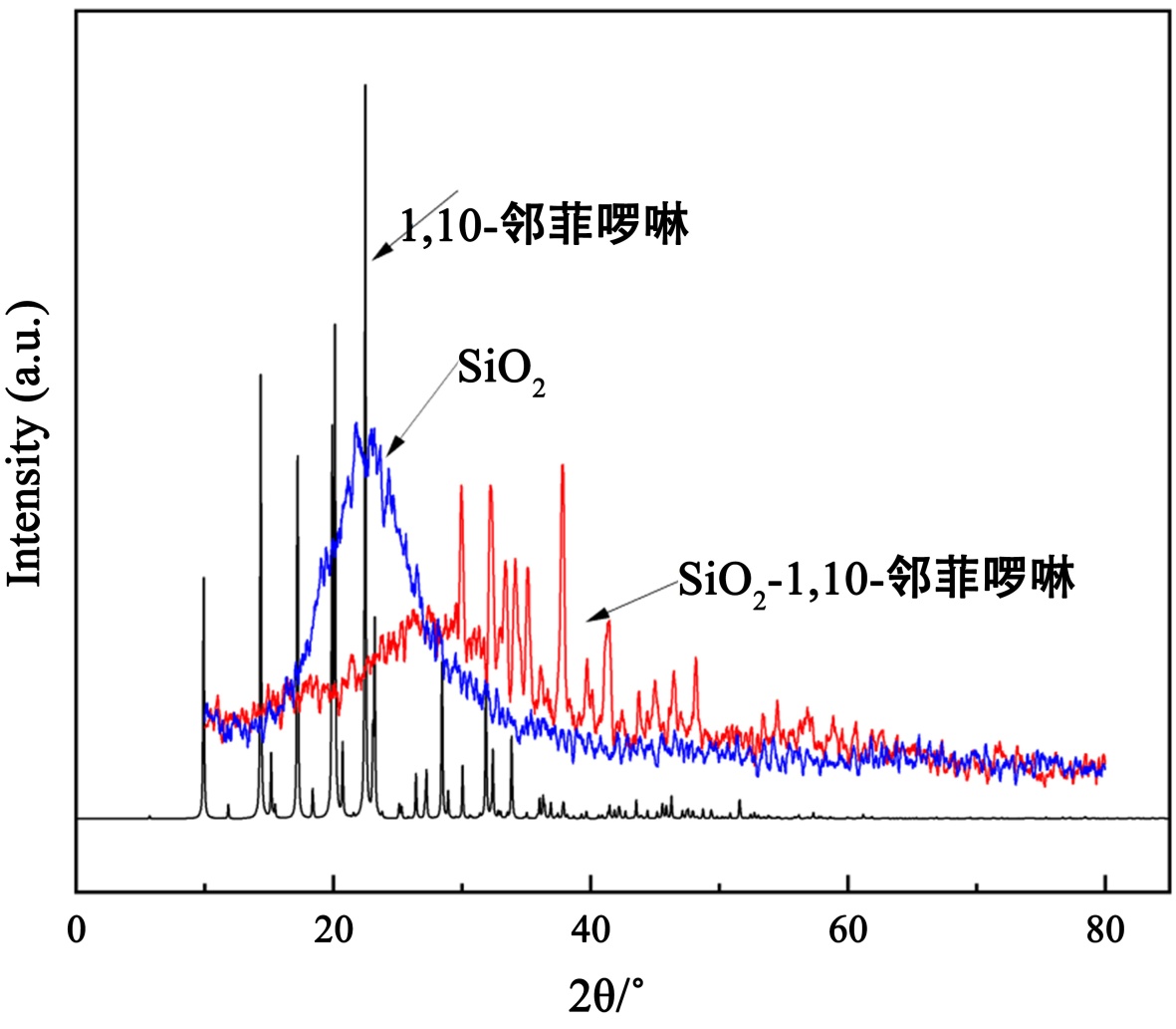 图3为SiO2的X-射线衍射图谱、1,10-邻菲啰啉衍射图谱和SiO2-1,10-邻菲啰啉杂化材料的X-射线衍射图谱。如图所示,可以看出SiO2衍射峰出现在2θ = 22˚左右,而SiO2-1,10邻菲啰啉杂化材料在2θ = 22˚处的衍射峰比SiO2和1,10-邻菲啰啉的峰明显较弱,其特征峰强度和特征峰位置与测试图谱并不吻合,SiO2-1,10邻菲啰啉杂化材料在2θ = 30˚处及以后的特征峰强度比测试图谱强,这说明SiO2和邻菲啰啉复合之后,杂化材料的结晶度增强了,表明了SiO2和邻菲啰啉分子之间存在着较强的作用力,致使杂化材料中晶型结构发生了不同于SiO2晶型结构的改变。