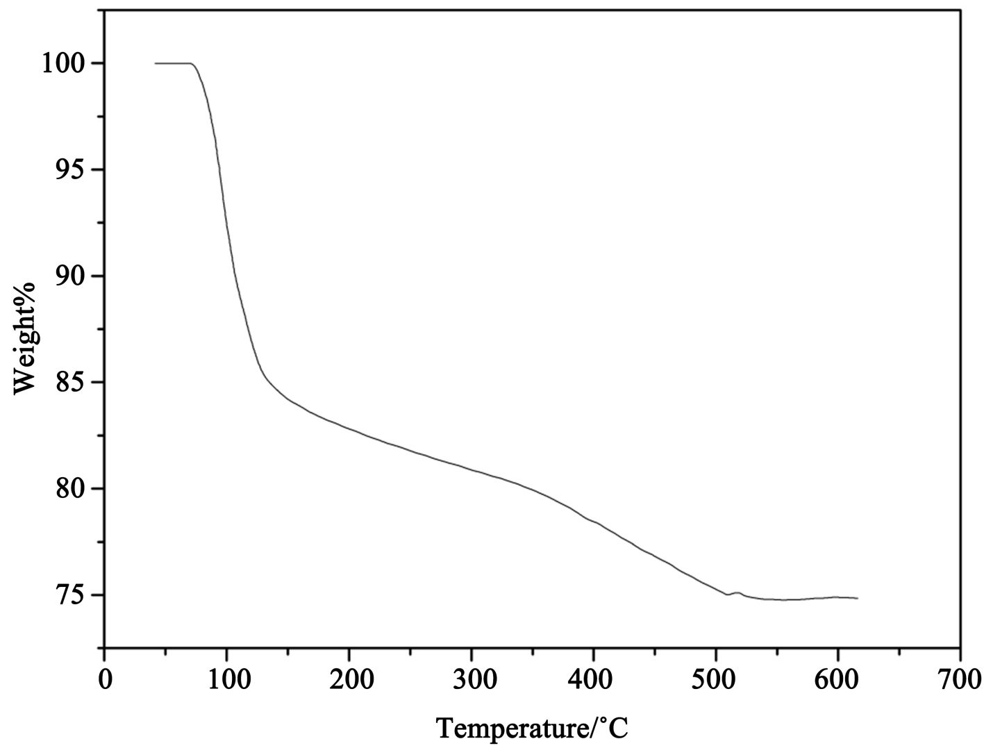 从杂化材料的热重图4中可以得知,该反应在100℃~500℃重量总量是减少的,到500℃减少了1.28 mg,说明加热中可能存在分解或者有水分子的逸出。但是500℃之后杂化材料的重量总量保持稳定,说明白炭黑和邻菲啰啉分子间结合能力强,所以杂化材料的热稳定性能较好,杂化材料在700℃温度下热失重为25%。