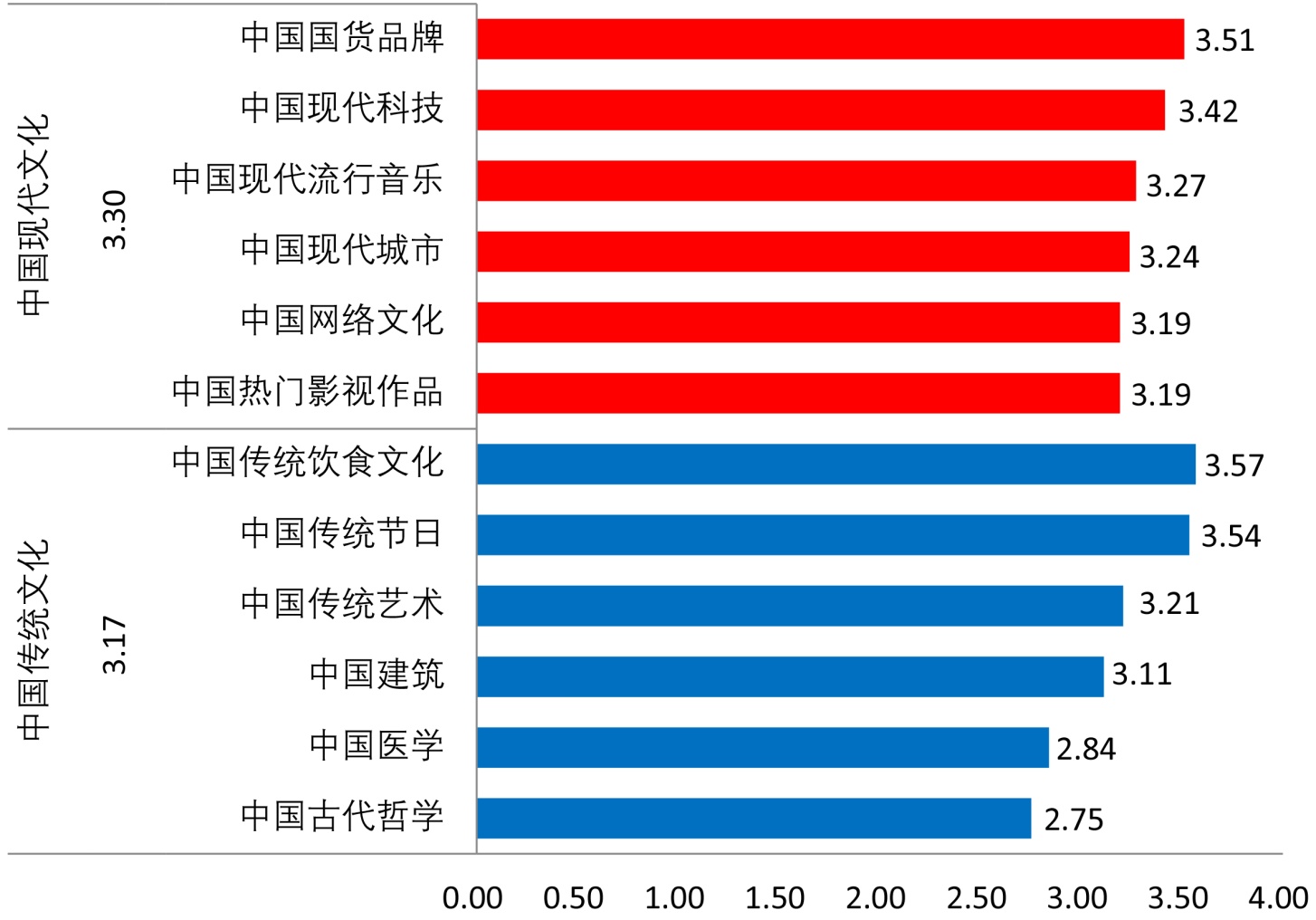 图1显示,中国传统文化中了解程度最高的是“中国传统饮食文化(3.57分)”和“中国传统节日(3.54分)”,而对“中国古代哲学(2.75分)”和“中国医学(2.84分)”了解不多;中国现代文化中了解程度最高的是“中国国货品牌(3.51)”和“中国现代科技(3.42)”,其他几个文化元素的得分相对均衡,无明显偏低的项目。