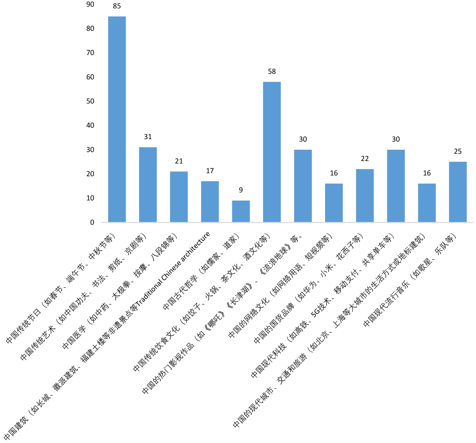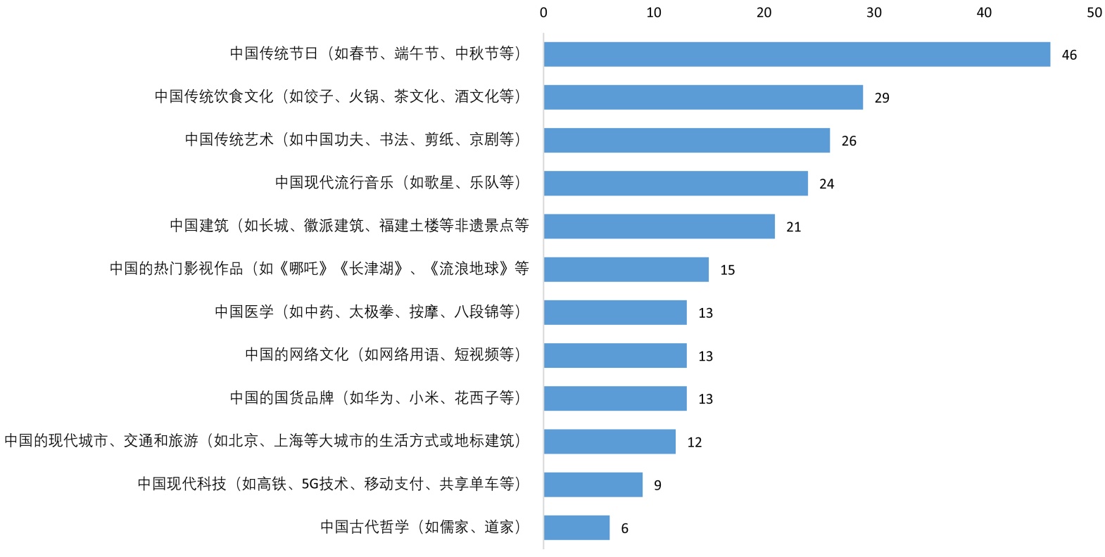 问题9是关于来桂留学生在媒体上发布的关于中国文化的内容,选项与问题1和2的传统和现代元素一致,按频数降序排列如下图所示: