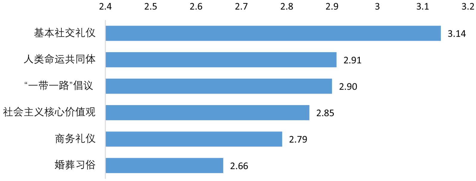 图3显示来桂留学生对“基本社交礼仪”(3.14分)的认知程度最高,此项是留学生日常生活中直接接触的内容;“人类命运共同体”(得分2.91)、“一带一路倡议”(2.90分)的认知程度居前,这两项是具有国际影响力的国家倡议,留学生的认知相对直接;对专业领域的“商务礼仪”(2.79分)和社会生活特定方面的“婚葬习俗”(2.66分)了解甚少。