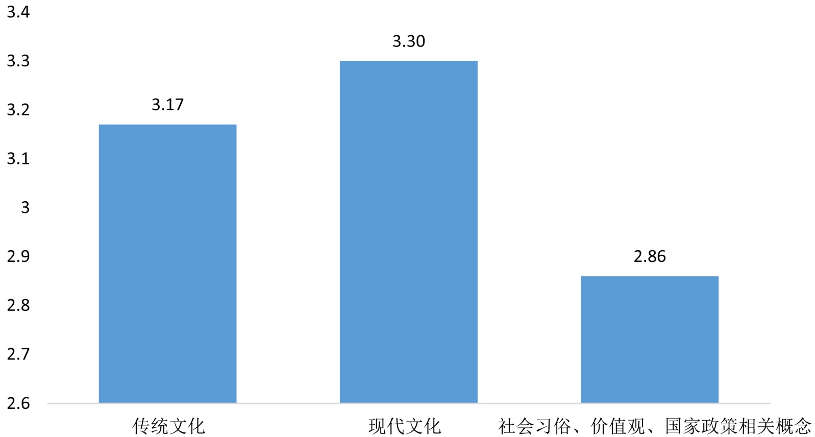 来桂留学生对中国传统文化、现代文化和社会习俗、国家政治等相关概念认知程度按均值比较,如下图所示: