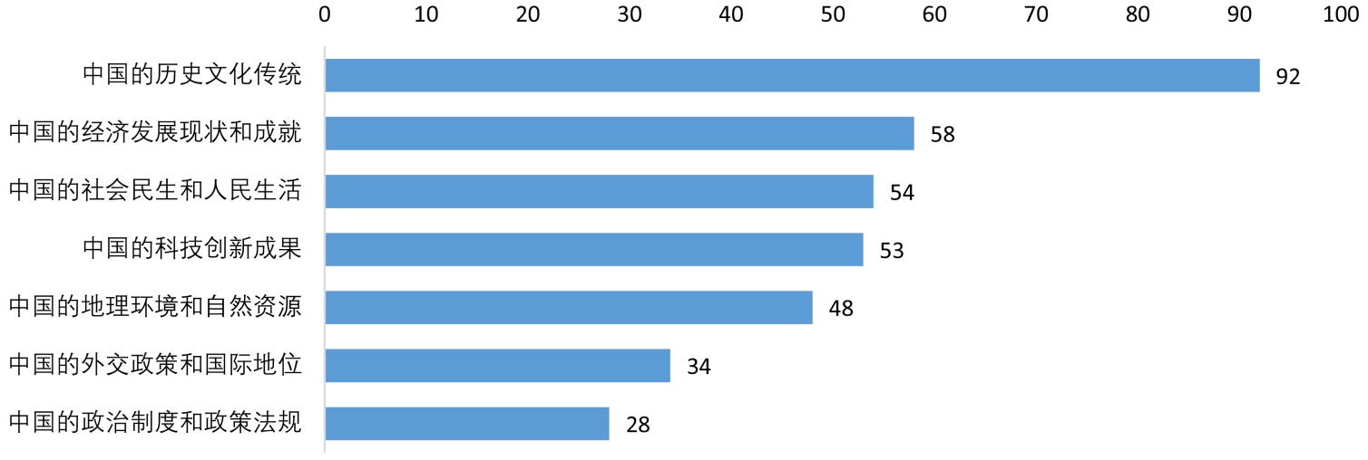 图6数据显示,来桂留学生课程主要教学内容是“中国的历史文化传统(92)”,“中国当代经济发展现状和成就(58)”、“中国社会和人民生活(54)”、“中国的科技创新成果(53)”的了解程度持平,但相较“中国历史文化传统”的内容相差较远;“中国的地理和自然环境(48)”、“外交政策和国际地位(34)”排名较后,说明在课程和活动中接触较少;“中国的政治制度和政策法规(28)”是在课程和课余活动中接触得最少的内容。只有一位受访者填写“中国的宗教信仰、诗”,一位填写“旅游目的地”。这一结果也与问题1、2、4的认知情况相符,课程和课余活动接触得越少的内容,认知水平越低。