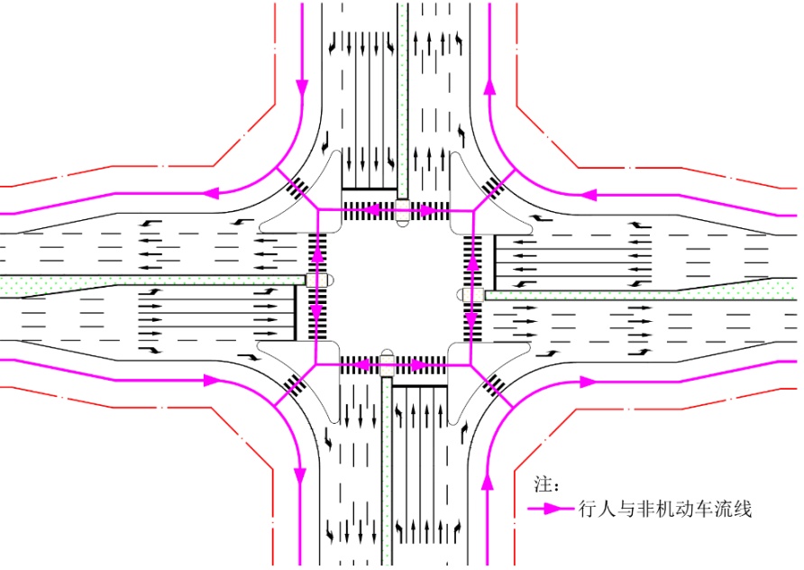 Figure 2. Traffic organization and layout schematic for pedestrians and non-motorized traffic at ıntersections with channelized ıslands