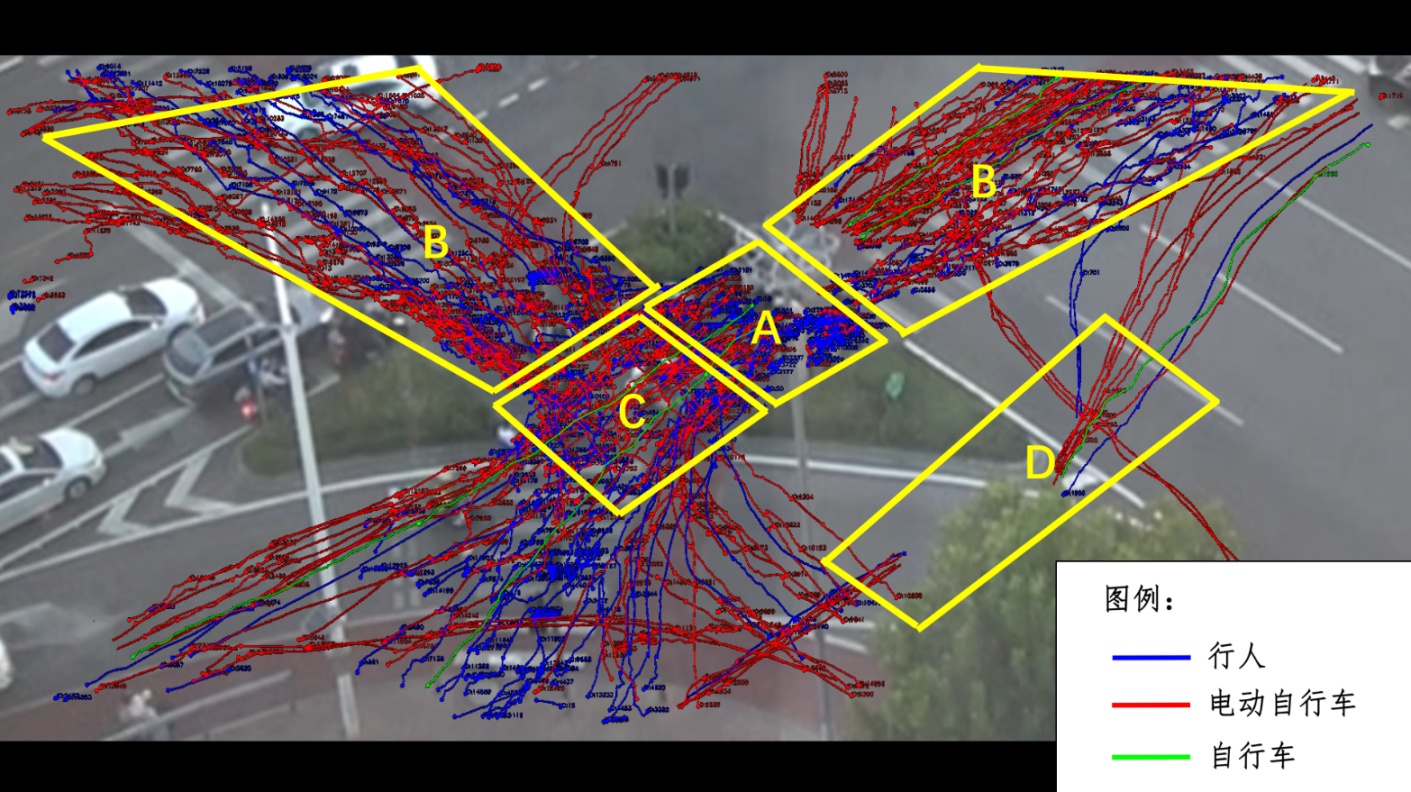基于YOLOv12检测结果,提取类别标签为pedestrian、bike、e-bike的检测目标时间序列位置点,生成其移动路径轨迹。图3所示轨迹分布特征表明:区域A为慢行交通等待过街区域,区域B为慢行交通正常通行区域,区域C为相交方向慢行交通冲突集中区域,区域D为慢行交通溢出交通岛通行的区域。