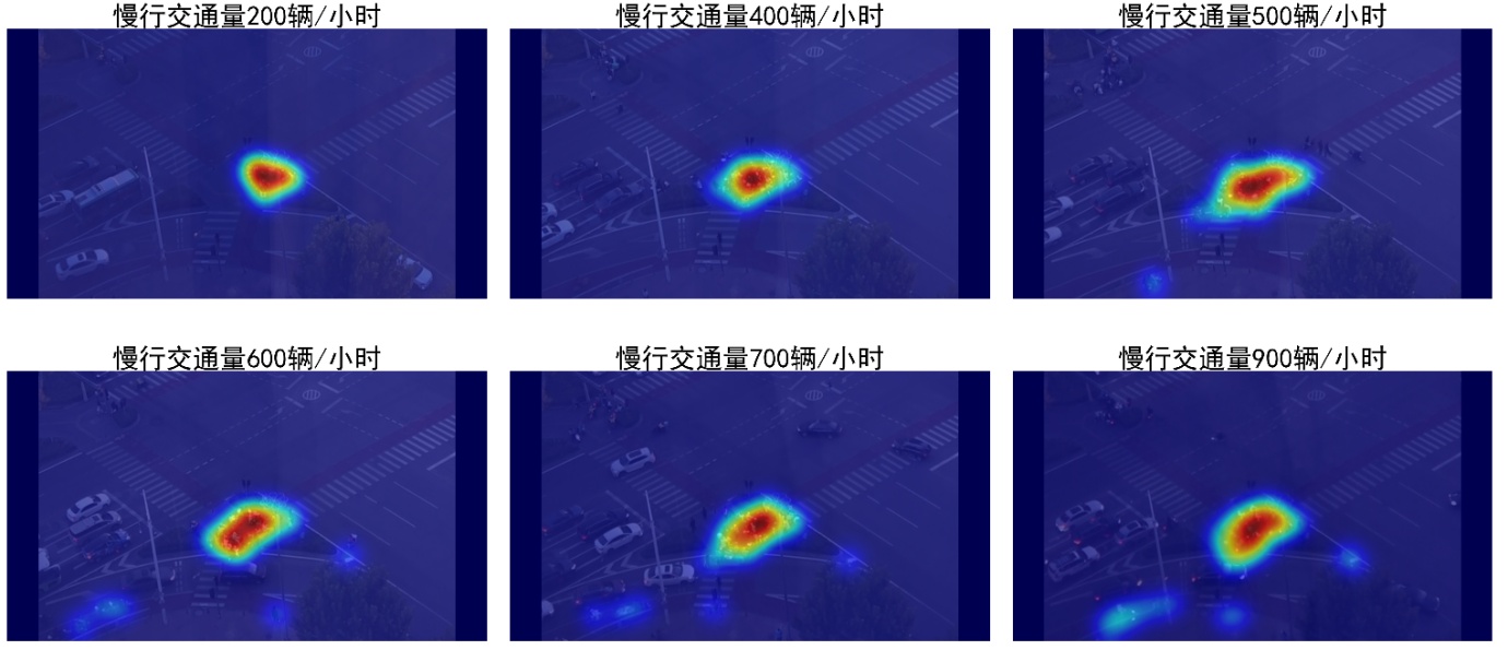 基于目标检测数据检测识别框的中心点坐标,应用高斯滤波方法处理后生成空间分布热力图。由图4可知,当慢行交通量达到400~600辆/小时,该交通岛外空间开始出现慢行交通等待通行,说明此时交通岛空间区域饱和并开始出现溢出现象,此流量范围为该交通岛发生溢出的交通量临界阈值。