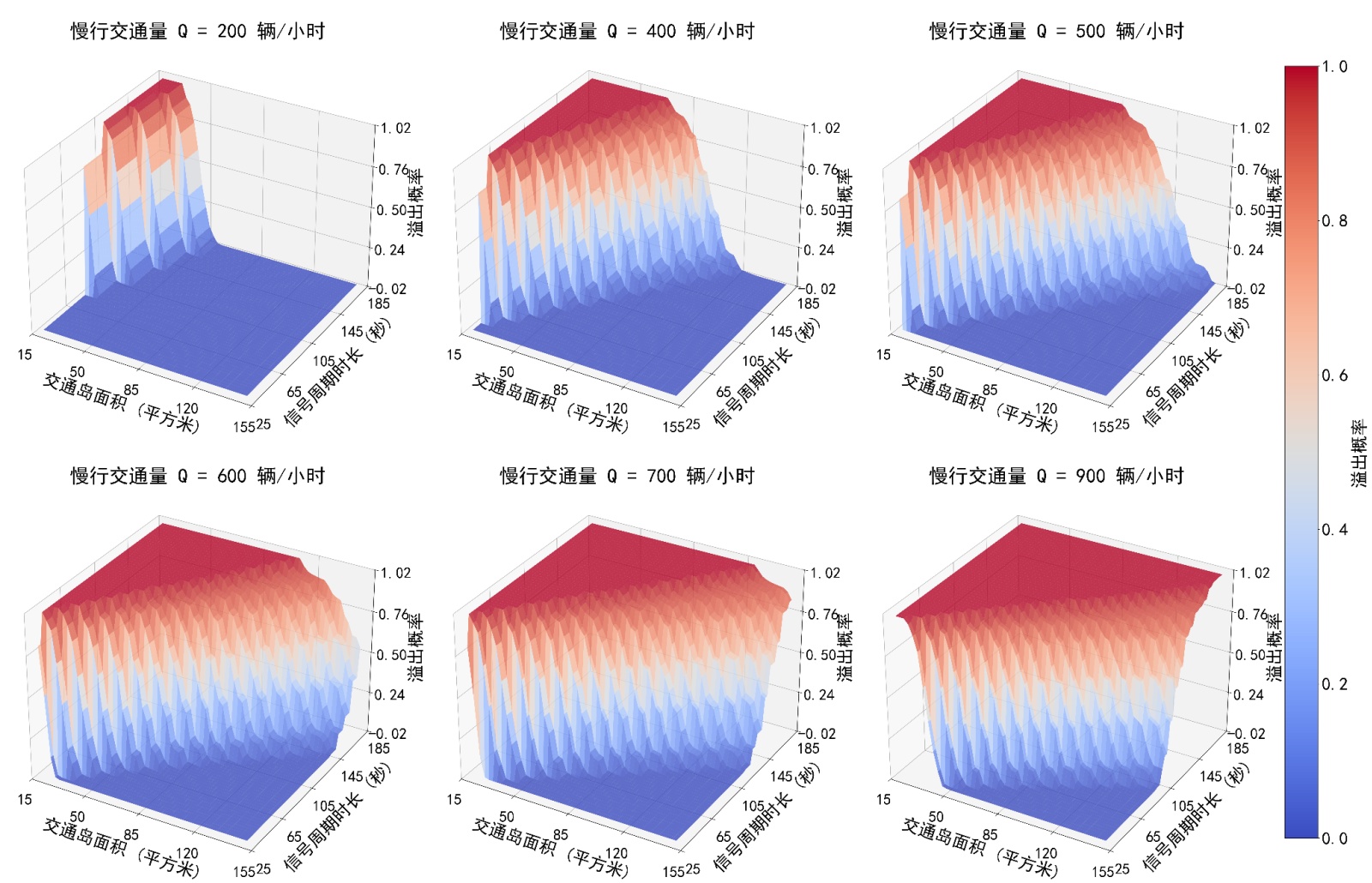 交通岛面积、信号周期时长和慢行交通量之间存在显著的相互制约关系。在一定的交通量下,增大交通岛面积或缩短信号周期均可有效减低溢出概率,但是在实际交通运行过程中,交叉口内可用于设置交通岛的面积是有限的,缩短信号周期则可能会影响机动车通行效率,因此需要找到交通岛面积和信号周期时长的平衡点。