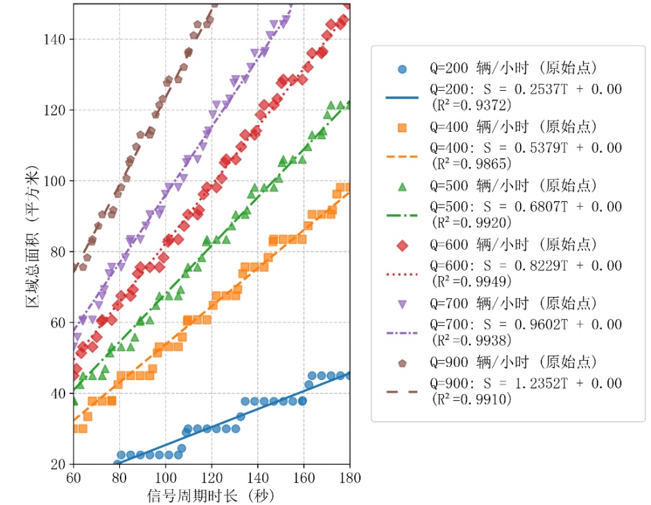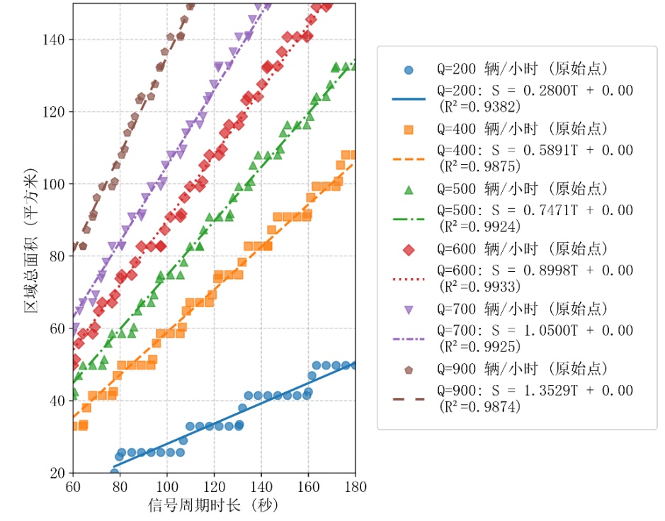 提取不同交通量下不同溢出概率的临界曲线(如图11),该曲线表征了区域面积与信号周期时长在临界状态下的关系,通过回归函数模型拟合: