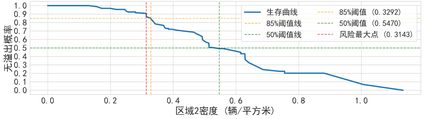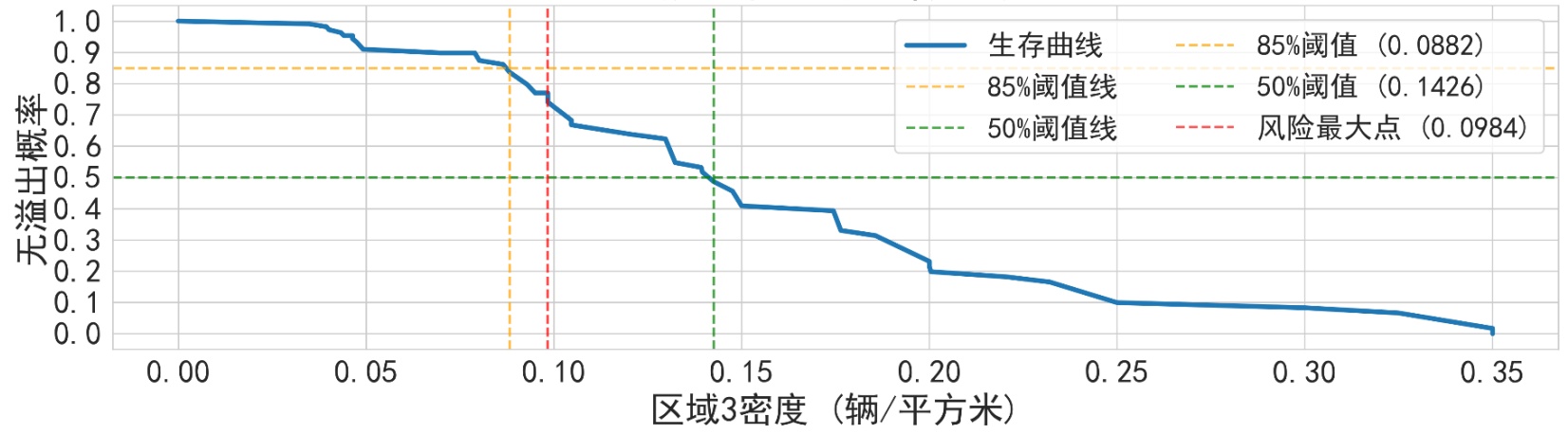 为确保模型评估的客观性,采用系统抽样的方法,从已有调查数据中选取4个交叉口(合计16小时)的数据用于模型的构建与训练,剩余1个交叉口(合计4小时)的数据作为测试集,用于后续模型的验证与性能评估。在整个建模过程中,严格保证测试集数据完全未被使用,以体现评估结果的独立性和有效性。再次采用Kaplan-Meier生存分析法,以区域3密度作为自变量,以溢出事件作为失效事件,构建相应的生存曲线,并确定生存概率为50%时所对应的密度为基于此训练集的临界密度阈值,即0.14辆/