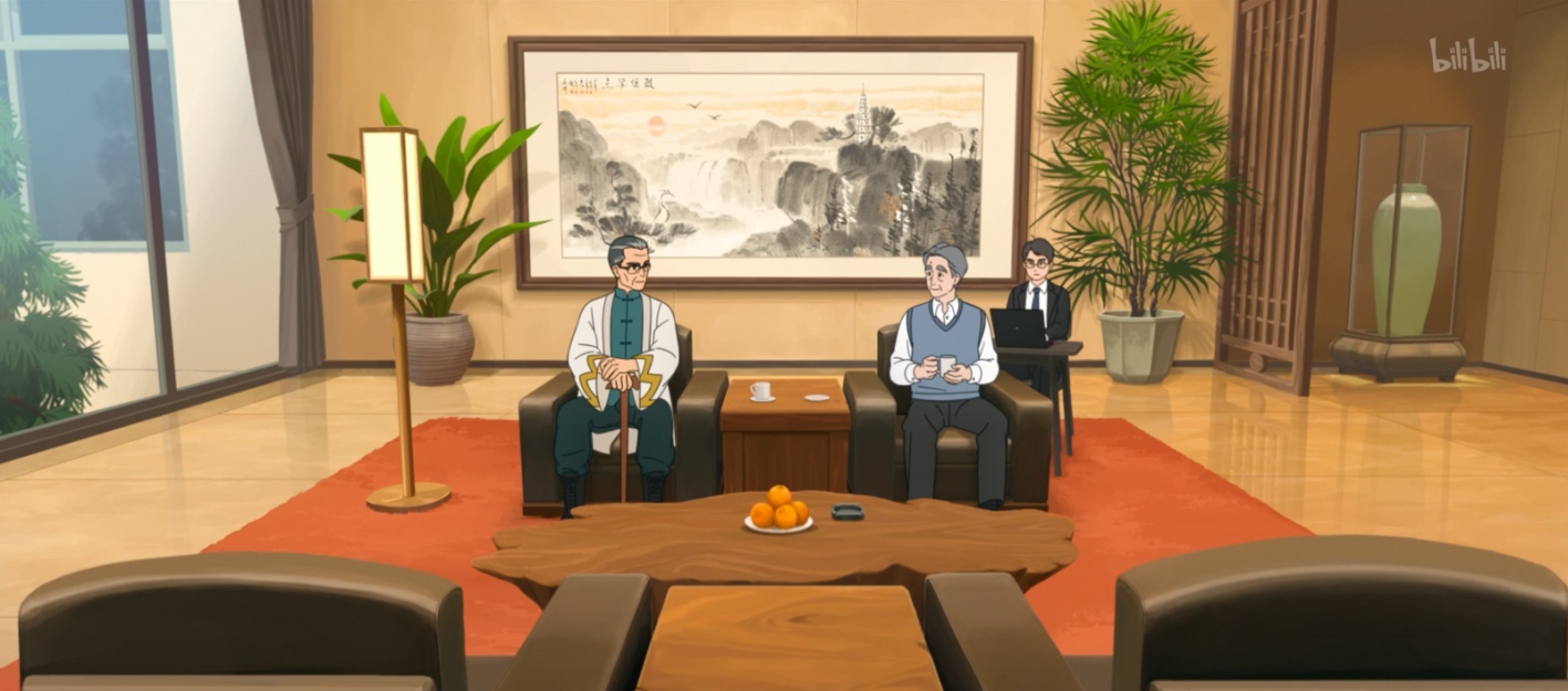 在叙事再现中,参与者的动作是意义的源泉。在人和妖就会馆遭遇人类袭击事件的调查进行谈判时,双方代表目光相接,视线交汇,构成反应过程(见图1);两人握手的动作形成交汇的矢量线条指向彼此,构成行动过程(见图2)。双方代表语调沉稳有力,谈判场景色调柔和,以暖光、绿树以及背景的鸟鸣声共同营造平和舒缓的氛围,谈判双方左右对坐,画面以水平视角呈现,传递出克制、相互尊重、平等对话的姿态,进一步强化了“和合”价值观中“守中致和”的理念,彰显了两方阵营通过对话化解纷争的“和合”智慧。