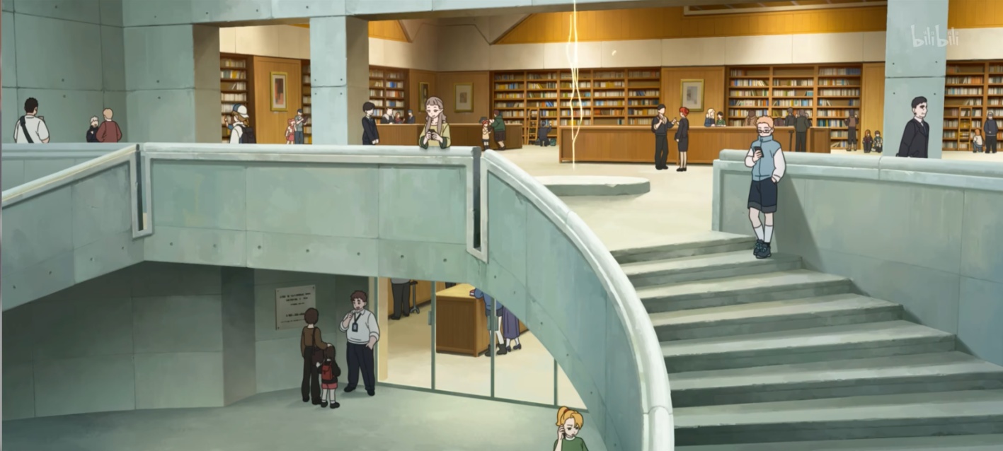 在概念再现部分,影片以小黑和鹿野的调查为线索,串联起大世界中各具特色的妖灵会馆的风貌。会馆作为多元共存、井然有序的“和合”空间,概括性地展现兼收并蓄、包容互鉴的“和合”图景。这些会馆不仅是人和妖日常生活交流的场所,更承担着诸如餐厅、图书馆等现实性的功用(见图3、图4)。在这些会馆中,现代都市与自然秘境并置且交融,人和妖在衣食住行、科技发展上别无二致,展现出深度的融合。在海德格尔看来,建筑空间本质上其实是属人的空间,此时的会馆并不只是纯粹的交通枢纽或是收容之地,而是人与妖交流、协作、栖居的场所。在影片的视听呈现中,不同会馆的风貌随着笛声与小提琴的主旋律渐次展开,背景中混杂的人声进一步渲染出生动的生活气息。现代场景与自然景致交错出现,人与妖以散点构图的方式分布于画面中心与边缘,共同构筑出一幅日常繁忙而又温馨自然的生活图景。影片借助各具特色的会馆场景,凝练“和合”的视觉意象,不仅展现人与妖在同一个世界中的深层连结,更诠释了二者作为彼此相依的邻居共生共在的关系本质。同时,会馆的设计高度呼应中国各地的风土人情,生动展现了当代中国的风貌。