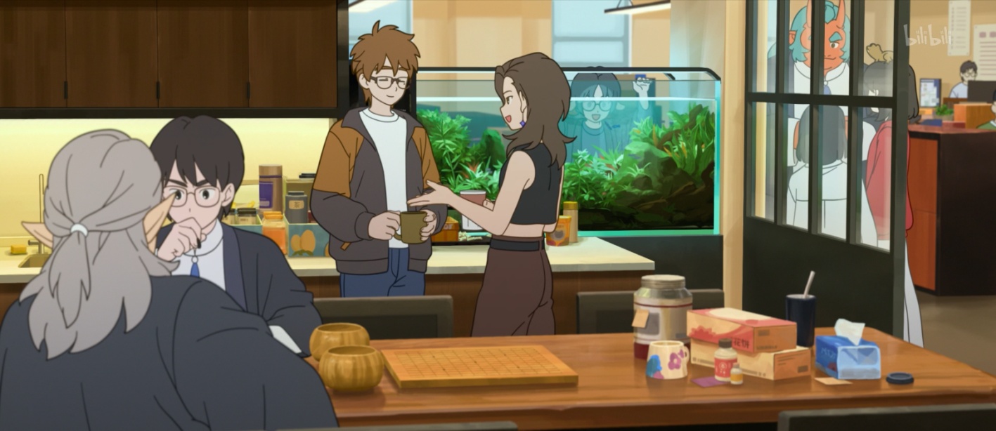 图像中的态度主要通过视角来体现。拍摄角度隐含权力与情感态度,是影片呈现“和合”价值观中平等理念采用的关键手段。影片中大量水平视角与平视镜头,不仅为观看者营造出在场感,还能消解权力关系,营造平等、对话的视觉氛围。在人和妖合作谈判的场景中,水平视角的运用勾勒出平等对话的态度(见图1、图2);而在呈现妖灵会馆风貌时,芸芸众生在水平视角下各司其职,视觉固化“平等共生”的理想状态(见图4、图7、图10)。