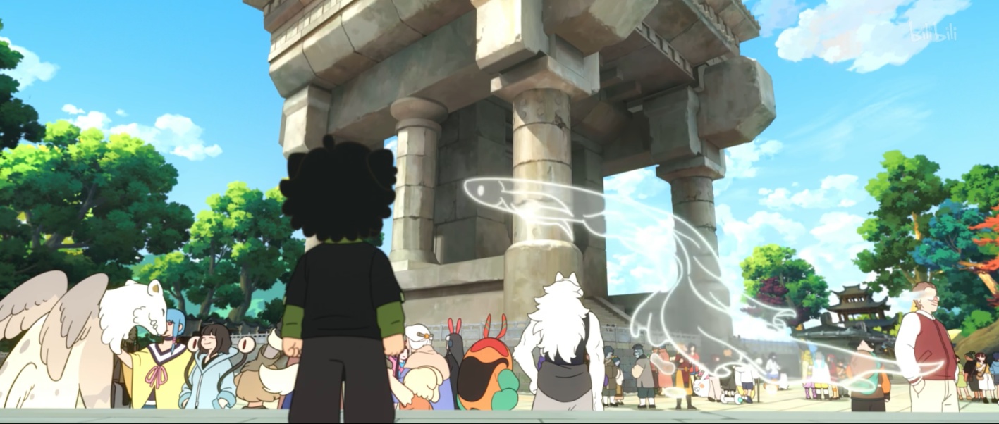 显著性指的是构图元素吸引观看者注意力的程度。影片通过控制元素的突出程度,引导观众视线,分层呈现“和合”的复杂内涵。在刻画人物时,影片避免以视觉大小定义尊卑秩序。例如小黑在见到比他年长的师侄时,对方主动弯腰行礼,以平视姿态交流。这一互动通过动作和情境而非体型差异来体现尊重和地位,生动体现了“和而不同”的包容平等精神。在众生群像中,不同体型的角色通过位置和动作设计获得平衡的视觉权重,避免某类角色因体型被忽视,整体构图错落有致;而作为精神象征的传送门则被置于中心,既形成视觉焦点,又体现“和谐共生”在多元共存中的核心地位,在视觉叙事中强化了“和合”的理念(见图13)。