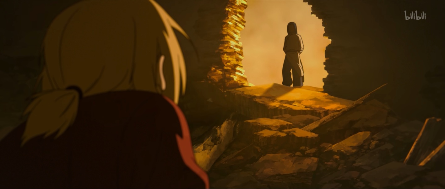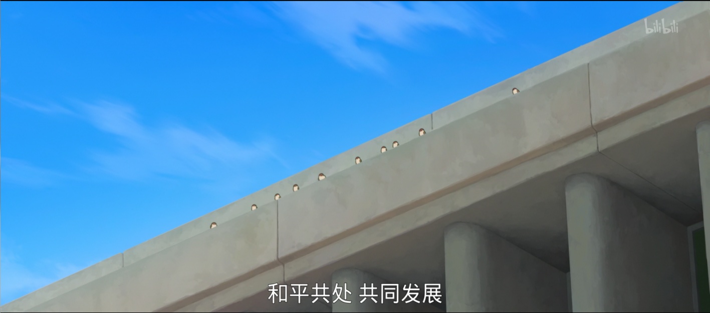 框架,即取景,通过线条、空间、色彩等手段分割或是连接画面中的元素,以此来表现在某种意义上是属于还是不属于的。在呈现全景时,影片常用树枝、屋檐等自然元素形成柔和框架,将角色包容其中,形成“和合”的视觉摇篮(见图10)。在表达冲突时,影片也并不回避使用分割线。例如在讲述鹿野和无限的相遇时,影片使用弧形框架将两人的构图分割,与四周战争后的残垣断壁形成对比。但两人交汇的目光形成了跨越分割线的互动,强调“和合”不仅是在承认差异与伤痕基础上的重建,更需要双方主动对话、重建联系(见图14)。