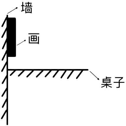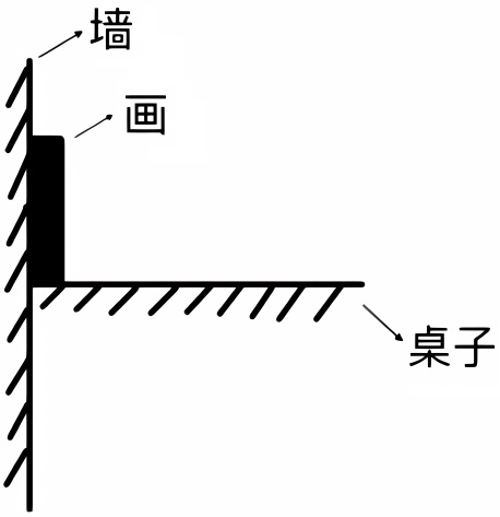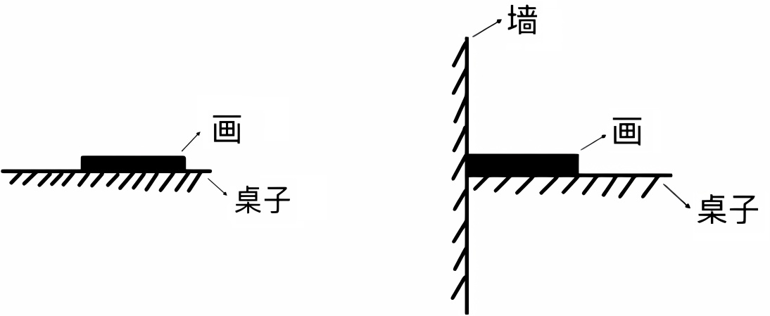 当目标物为无厚度、可以吸附的物体,如“画”,参照物为横向的平面,如“桌子”时,共画出四种图式。其中图1为横向接触图式,分为a、b两种;图2为纵向接触图式,图3为纵向分离图式。在此类空间关系中,“墙”作为空间环境的构成要素,属于辅助性的空间参照物,我们将其定义为次级参照物,“桌子”为核心参照物。