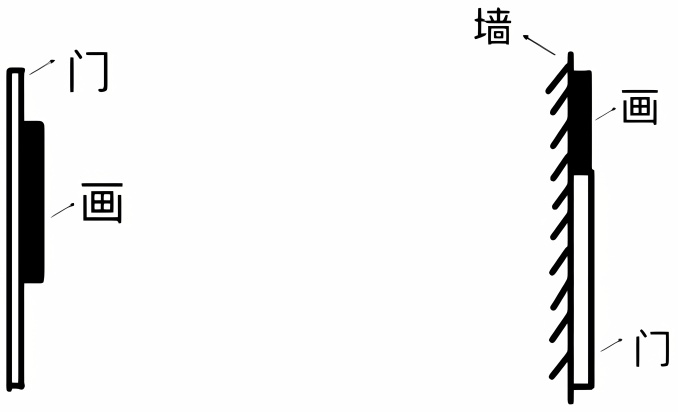 当目标物为无厚度、可以吸附的物体,如“画”,参照物为纵向的平面,如“门”时,共画出三种图式。其中图4为纵向接触图式,分为a、b两种;图5为纵向分离图式。在此类空间关系中,“墙”作为次级参照物,“门”为核心参照物。