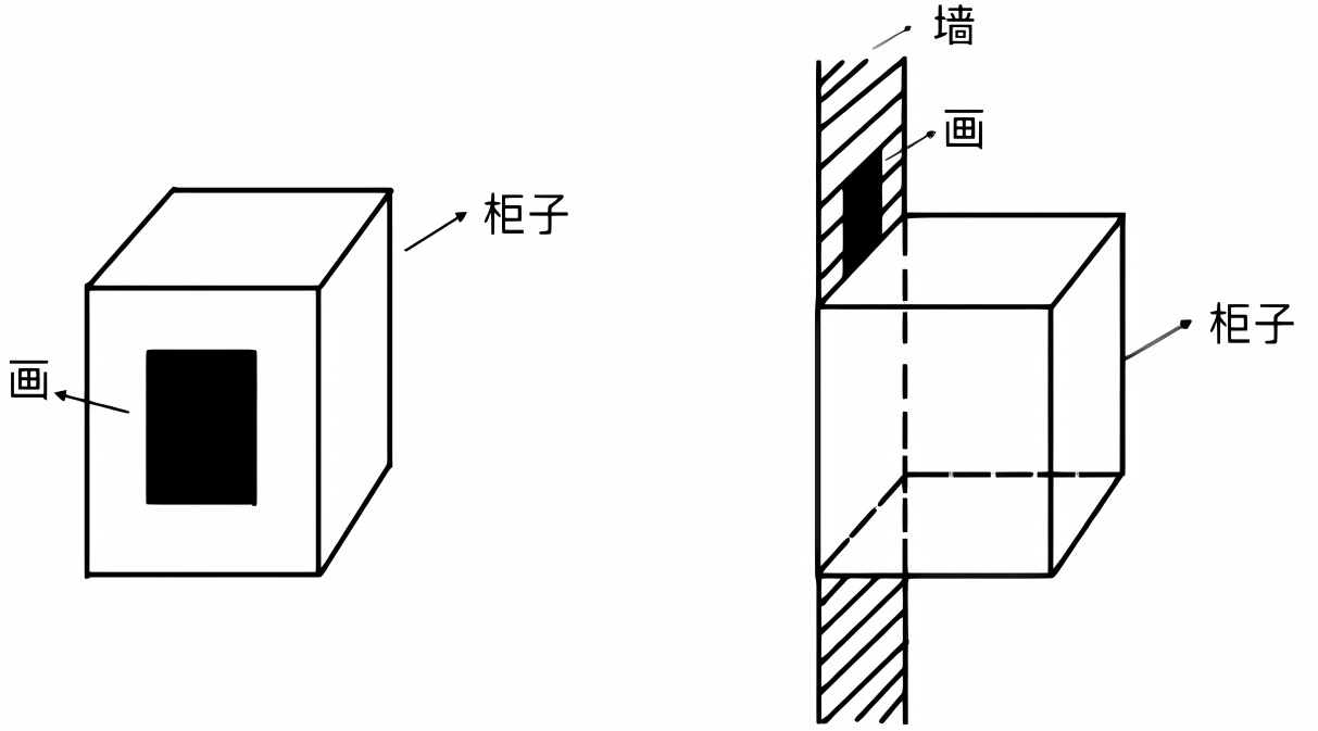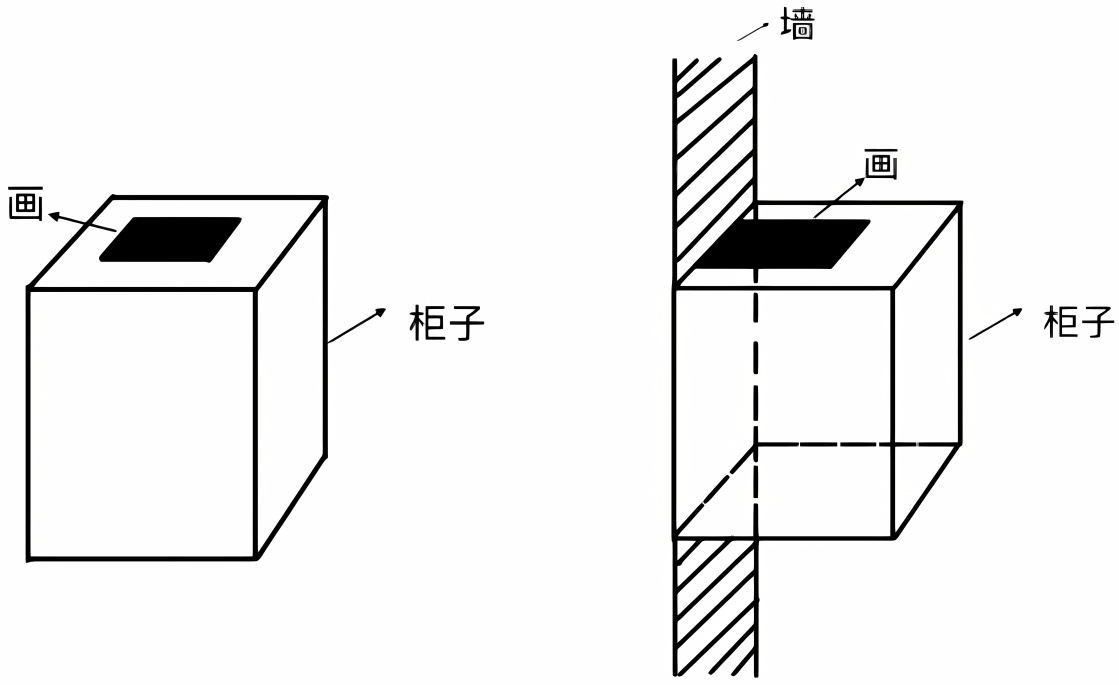 当目标物为无厚度、可以吸附的物体,如“画”,参照物为立体的物体,如“柜子”时,共画出五种图式。其中图6为横向接触图式,分为a、b两种;图7为纵向接触图式,分为a、b两种;图8为纵向分离图式。在此类空间关系中,“墙”作为次级参照物,“柜子”为核心参照物。