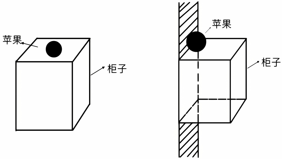 当目标物为有厚度、可以放置的物体,如“苹果”,参照物为立体的物体,如“柜子”时,共画出两种图式,即图11横向接触图式,分为a、b两种。在此类空间关系中,“墙”作为次级参照物,“柜子”为核心参照物。