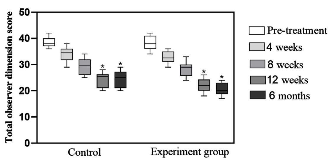 对两组的观察者评分进行组间比较。治疗前的原始观察者评分数据38.43 ± 2.65分,对照组为38.50 ± 1.79分。