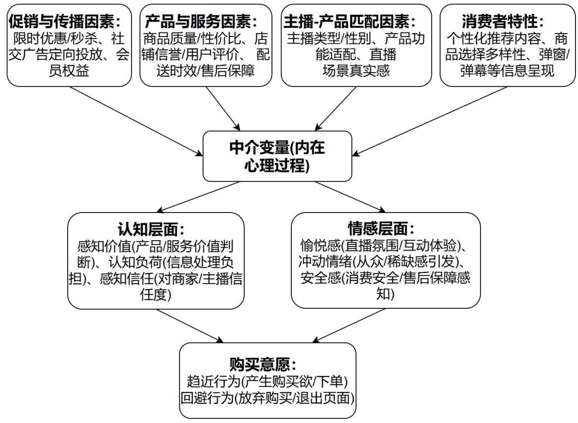 本研究的外部刺激因素(S)从营销、商品、主播、消费者自身四个维度,内在心理过程(O)区分认知与情感双重层面,消费者购买意愿及对应行为反应(R),基于S-O-R理论构建,呈现外部刺激因素通过内在心理过程对消费者购买意愿的影响路径。具体见图1。