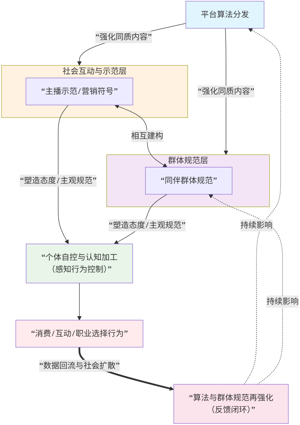 综上,研究缺口集中在:缺少以价值观为核心结果变量的混合方法研究;缺少对计划行为理论与符号互动在电商直播业态中的构念化落地;缺少面向平台与监管的可操作治理工具。本文据此提出:以价值观四维度为框架,构建“平台算法推送–主播示范效应[16]–同伴群体影响[17]–自我认知偏差”的循环机制模型,并给出可执行的协同引导路径。