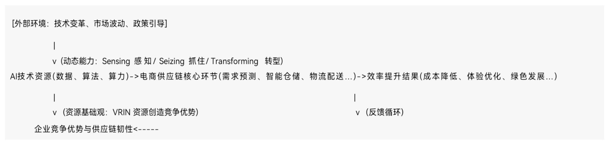 在本研究中,AI技术及其应用生态系统可被视为电商企业构建竞争优势的关键资源。同时,AI技术在供应链中的应用本质上是一种动态能力的体现:它极大地增强了企业感知市场细微变化(如通过社会情绪分析预测需求)、抓住市场机会(如快速调整生产与库存)以及转型组织与流程(如实现自动化运营)的能力。本文将以此框架分析AI如何通过赋能资源和提升动态能力,系统性提升电商供应链效率。理论框架如图1所示。