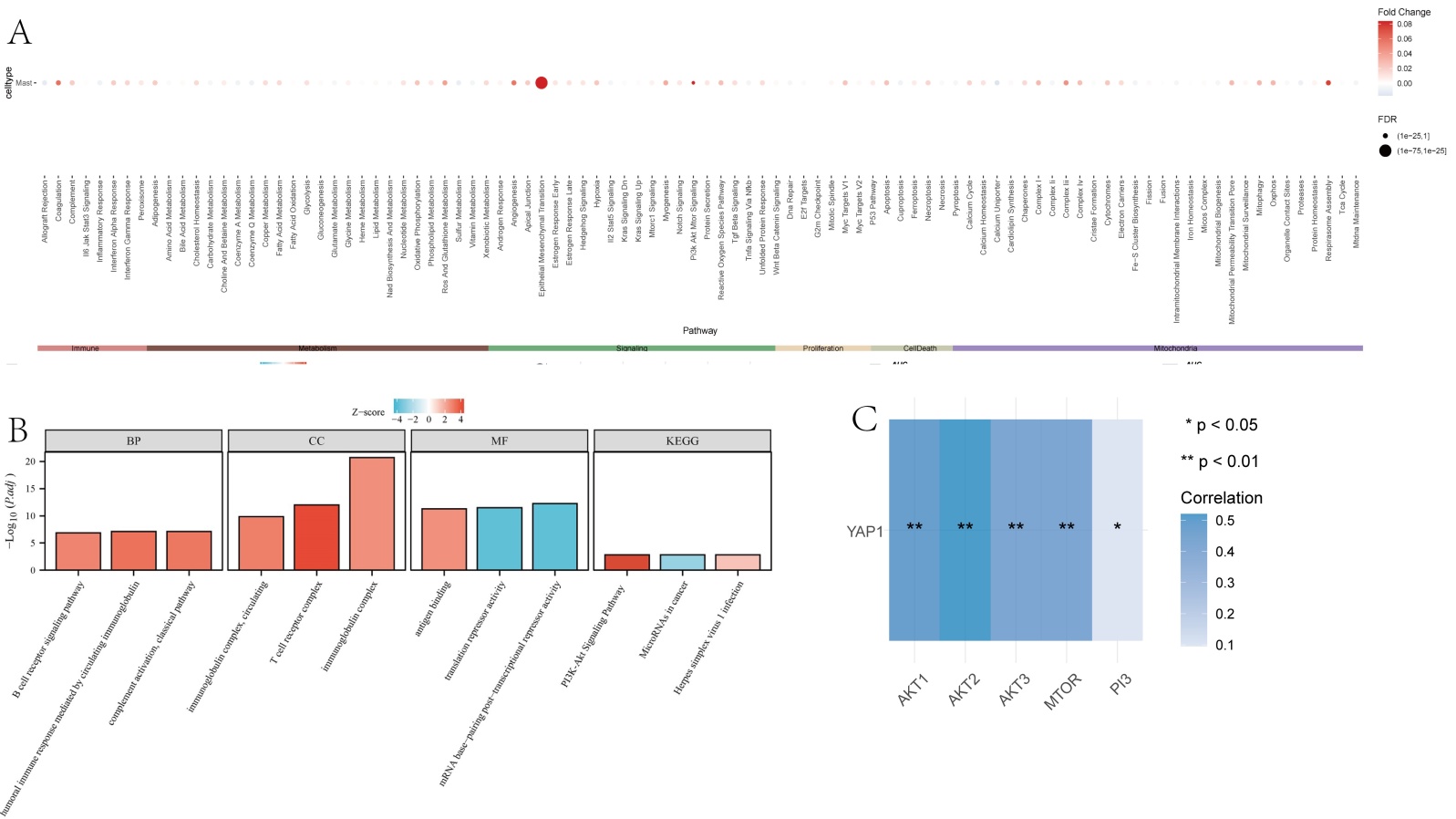 在发现YAP1基因在肝细胞癌的正常与病理组织中有差异性后,对该基因进行了后续分析,如图4所示,通过富集分析,分析了该基因可能的促癌机制,图4(A)中颜色越靠近红色则其相关性越高,圆点面积越大则其错误发生率越低,结果越可靠,横坐标则为不同参与调解方式及其代谢通路,具体的由此可见在信号转导通路中,上皮–间质转化及PI3K/AKT通路相关性较显著,B通过不同数据库再次印证,通过Z-score标准分数,表达不同通路的丰度值,在得到该基因可能会涉及PI3K/AKT通路后,如图4(C)所示,其颜色越深则相关度越高,通过TCGA数据库再次验证该基因与通路中核心蛋白的相关性,得到的结果表明AKT1,AKT2,AKT3及MTOR均有较强的相关性。