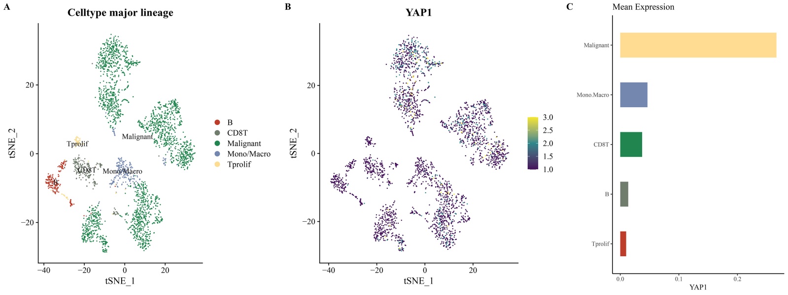 发现YAP1可能涉及到影响信号转导通路后,对其预后分析和重要临床指标进行分析,图5(A)中通过cutpiont函数,选取最佳截断值,B中绘制KM生存曲线,p < 0.05,对生存有影响,高表达预后差而低表达预后可,而后又对YAP1高低表达与Child分级及AFP表达量进行差异分析,其中B表示YAP1的高低与child分级尤其是A与B、C之间存在差异性,这对患者手术耐受存在一定指导意义,而AFP又是传统肝癌筛查指标,可见正常组与升高组之间存在差异,对此绘制ROC诊断曲线,发现曲线下面积为0.706,证明YAP1对肝细胞癌存在诊断价值,有一定诊断敏感性。单细胞细胞聚类t-SNE图,不同颜色代表不同类型的细胞见图6(A)。YAP1基因在上述A中各种细胞表达分布t-SNE图,不同颜色代表表达其丰度,颜色越亮代表细胞中该基因的表达高参照图6(B)。不同细胞中所选基因表达丰度柱状图见图6(C)。由此可见,在LIHC_GSE146115.h5数据中,恶性细胞表达YAP1的含量最高。