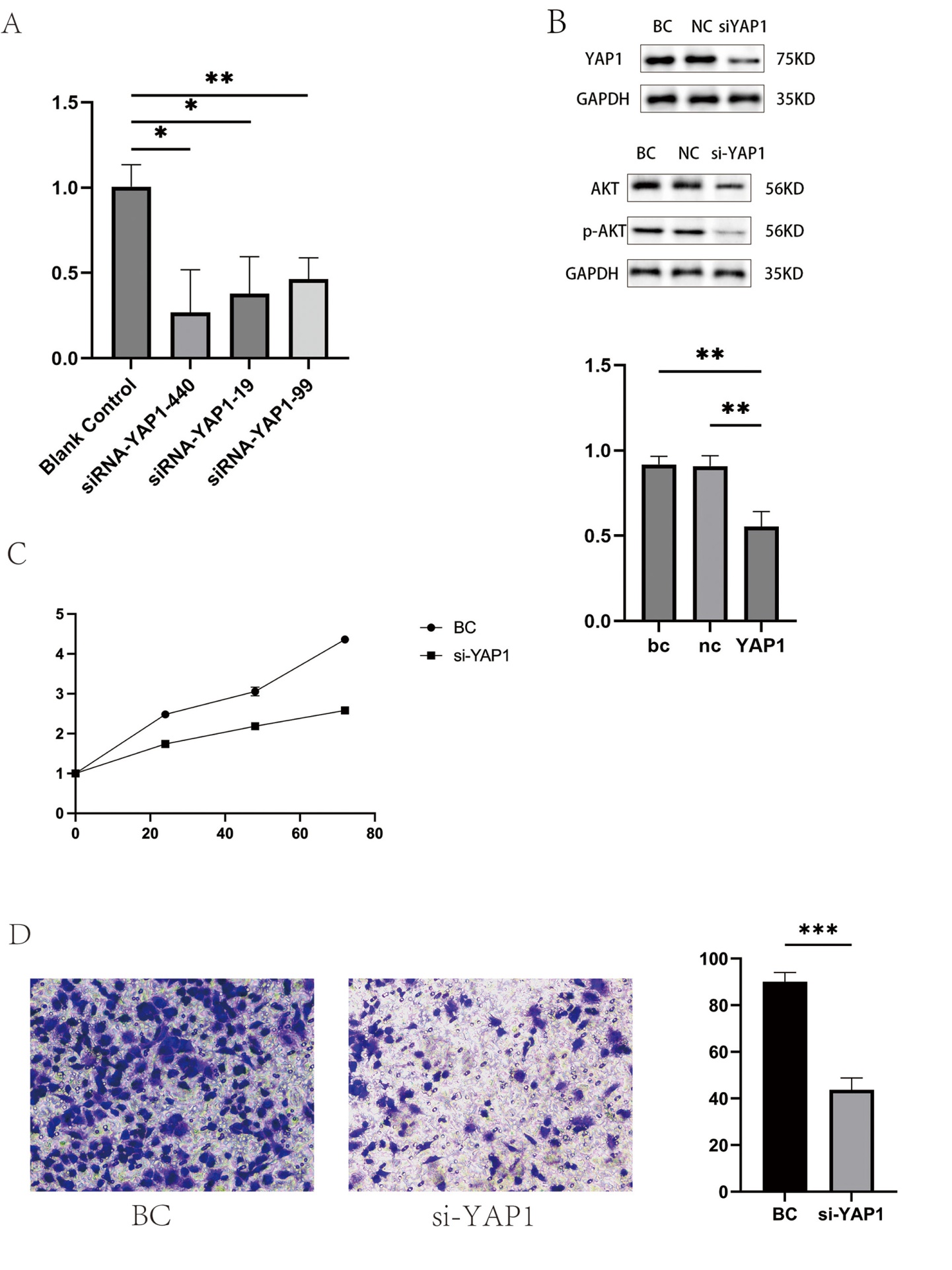 为继续明确该基因是否与肝细胞癌有关,在图7中,A为RT-qPCR,其中siRNA-YAP1-440敲低效果佳,后续所有模型塑造均使用该试剂;B为WB实验结果,其中YAP1蛋白表达降低,表明造模达到预期效果,随后进行C、D两步实实验,分别为CCK-8增殖实验及transwell侵袭实验,结果表示是将YAP1基因表达敲低后,肝癌细胞的增殖及侵袭能力降低。为进一步验证YAP1可能作用到PI3K/AKT通路中,对其通道核心蛋白AKT及p-AKT进行WB实验,并通过通道激活剂SC79,对通道进行挽救实验,结果如图8所示,A为WB结果,B、C仍分别为CCK-8增殖实验及transwell侵袭实验,但通过挽救实验,其细胞功能并未得到有区别的恢复。