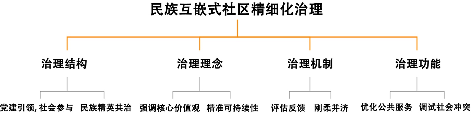 民族互嵌式社区精细化治理主要便从这四维度进行展开。其中治理结构聚焦于治理的主体,通过党委领导、政府主导、社会参与等形式,形成多元的治理主体,以政府为核心,引领治理的大方向,而在具体的治理实践中,发挥党员先锋的带头作用,树立榜样,打造民族精英角色,实现共治和调节民生纠纷;治理理念更强调文化方面的属性,以铸牢中华民族共同体意识为主线,社会主义核心价值观为引导,倡导共享的社区文化符号,此外还要针对不同社区进行精准治理和可持续性治理,提高精细化治理的效能;治理机制方面强调以什么样的手段实现精细化治理,通过建立评估和反馈机制,精准定位民族互嵌式社区的就业、教育、医疗等问题,由此制定具有针对性的政策建议并监测政策取得的成效。此外,细化民族自治条例与社区自治条例,明确民族事务的范围和边界,促使民众自觉遵守相关法律规定。还可通过民族社区之间的非正式文化形成软性的补充和约束,化解不同民族之间的冲突,通过刚柔并济的机制实现善治;治理功能则强调治理所取得的成效,针对不同民族群体的语言、文化需求,提供定制化公共服务,形成公共服务均等化,通过协商议事平台化解因习俗差异引发的矛盾,避免冲突升级,巩固精细化治理的结果与功能。四种治理维度能够有效的进行链接,能够结合社区空间结构、治理过程演化与文化心理调适,探索多变量交互机制。