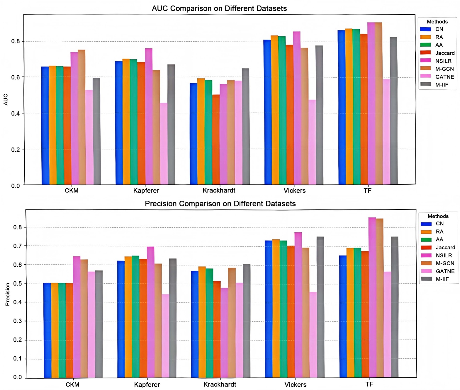 作为全局缩放常数,在单一层内并没有改变节点对得分的相对序位。但在CKM数据集上,移除阻尼导致AUC从0.5936微降至0.5951,这表明在动力学演化较为复杂的网络中,阻尼机制能通过细微的能量耗散模拟,为模型提供更具区分度的评分尺度,从而在边际上优化了全局排序。层间融合策略的对比揭示了自适应加权机制是M-IIF鲁棒性的核心来源。在Krackhardt和CKM数据集上,采用等权重融合(Equal Weight)导致性能出现显著回撤,其中Krackhardt的Precision从0.6065剧降至0.5117,CKM的Precision从0.5685跌至0.5224。这有力地证明了在结构异质性强的多层网络中,盲目融合非相关层会诱发严重的“负迁移”干扰。M-IIF通过CSL指标敏锐地捕捉层间相关性,起到了“信息过滤器”的作用,确保了辅助层信息的正向增益。通过移除高阶路径特征(Local Only)的实验可以观察到,模型在处理大规模稀疏网络时的“视野局限性”。在TF大规模数据集中,仅保留局部特征导致AUC从0.8255回落至0.8189。而在Kapferer数据集上,移除NCNT后Precision从0.6336下滑至0.6159。尽管在规模极小的Krackhardt数据集上局部特征表现出一定的离散优性,但综合全数据集来看,NCNT提供的长程拓扑线索为稀疏连接提供了必要的结构补偿,是模型维持全局预测精度的重要支撑。综上所述,消融实验证实了M-IIF的每一个组件均具有不可替代的结构化贡献。动态加权机制负责过滤层间噪声以对冲负迁移风险,而阻尼逻辑与高阶路径则通过精细化拓扑表征,共同构筑了模型在异质化场景下的预测韧性。