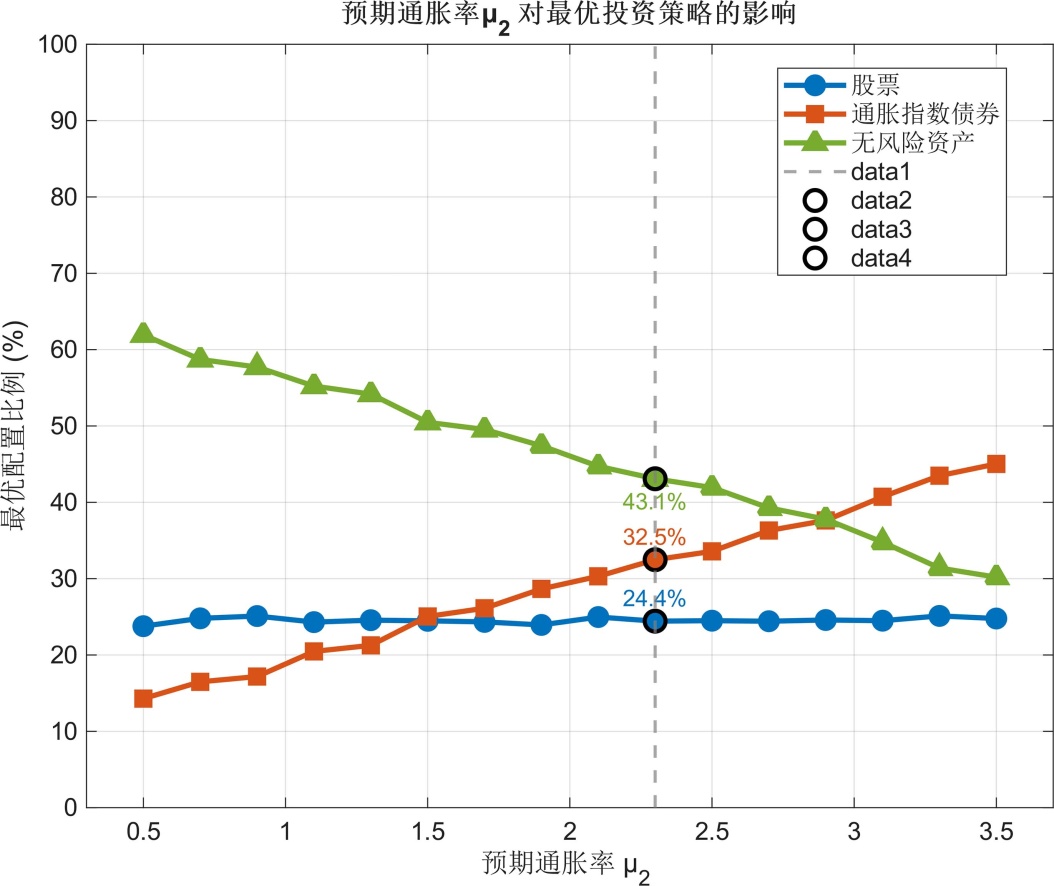 图2是预期通胀率的变动对三类资产的最优配置比例产生了显著而规律性的影响。如图所示,随着预期通胀率