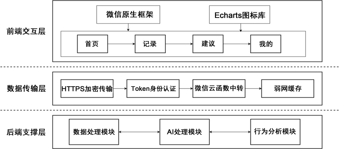 为实现轻量化体重管理场景下的精准干预目标,本系统将总体架构设计分为三层,如图1所示。前端交互层负责用户交互与数据采集,数据传输层用于保障数据安全以及数据转存,后端支持层确保AI与行为科学功能运行。