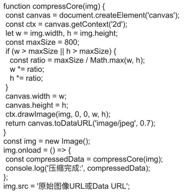 为完成对食物图像压缩的实现,前端采用canvas API对用户上传的图像进行梯度压缩,核心JavaScript代码如图2所示: