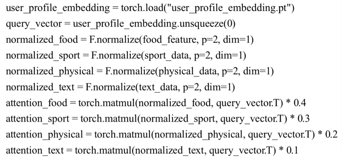 训练数据集来源于Food-101公开数据集、合作健身机构匿名化跟踪数据、内测用户授权数据及可穿戴设备API对接数据,经图像标准化、数值归一化、文本编码等预处理后用于模型训练;query_vector来源于用户画像Embedding,由基础信息、历史行为数据融合生成,替代随机生成逻辑。为完成对多模态数据融合的实现,后端采用“自注意力机制”确定每个模态的权重,核心Python代码如图3所示: