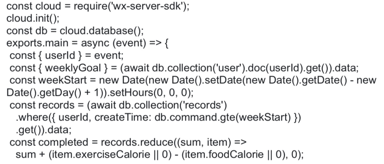 为更新每日目标进度,前端可以通过wx.cloud.callFunction来调用“calculateProgress”云函数,这样用户每日的饮食热量、运动消耗以及周目标完成度可以很方便被收集到,核心代码如图4所示:
