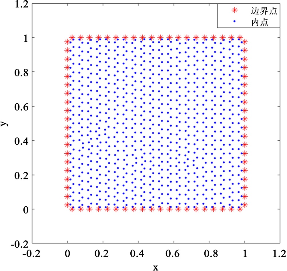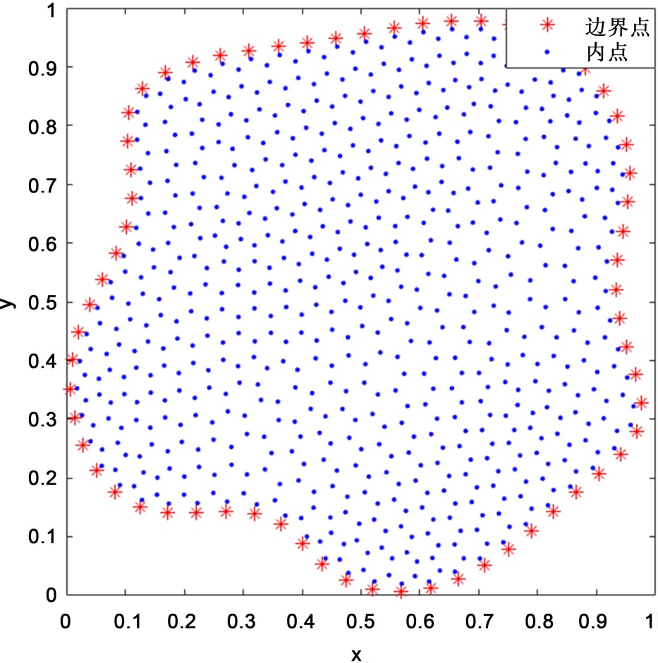这样最终得到了两个大型且易于计算的稀疏系数矩阵,如果改变计算区域的几何形状,仅更改区域内点的分布,对于不同的边界条件,也仅需使其满足对应的约束条件,这使得所提方法能够处理许多复杂的计算区域以及应对不同的边界条件问题。另外,需要注意的是,方程(3.2)和(3.3)中的系数矩阵是稀疏的,这样可以提高计算速度。