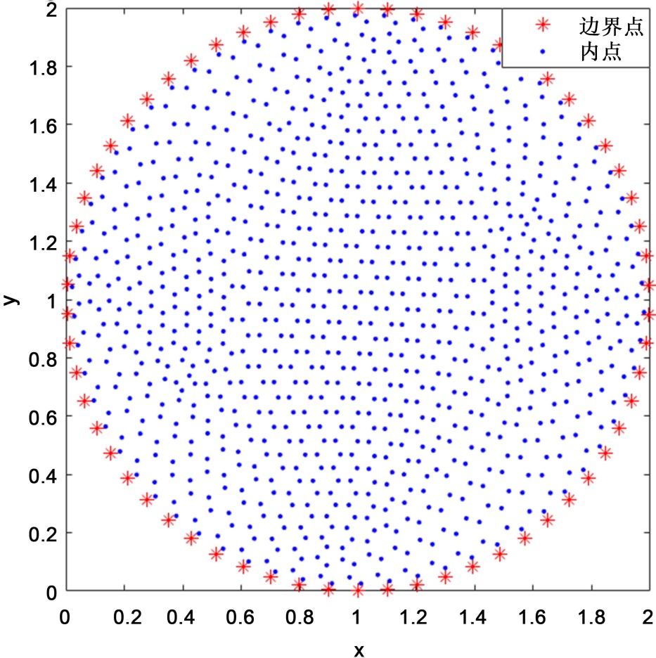 我们在圆形计算域上分布了4384个配置节点,其中包括126个边界节点和4258个内部节点。我们将时间区间从