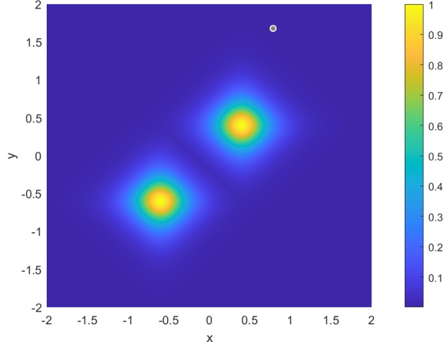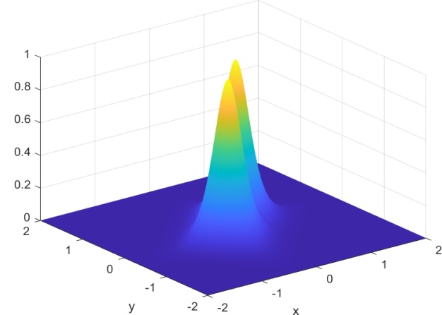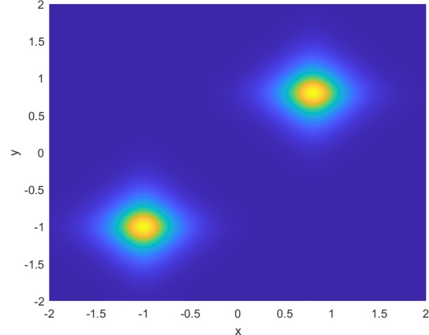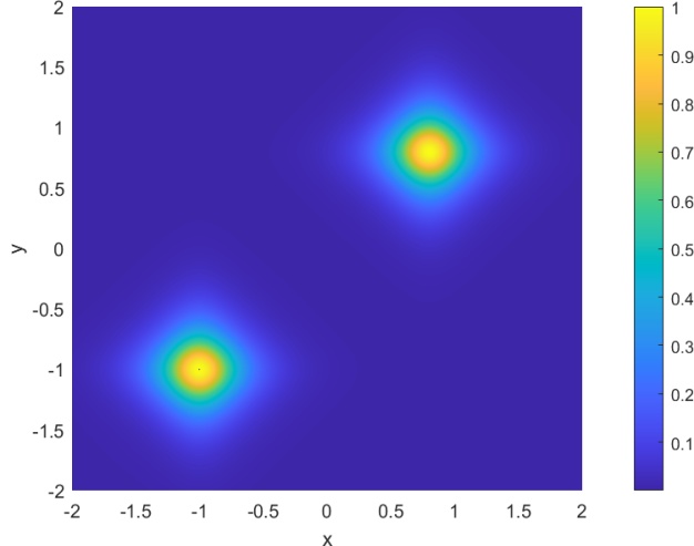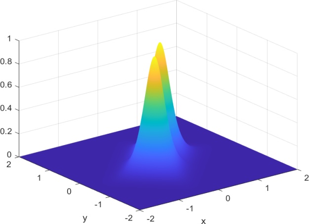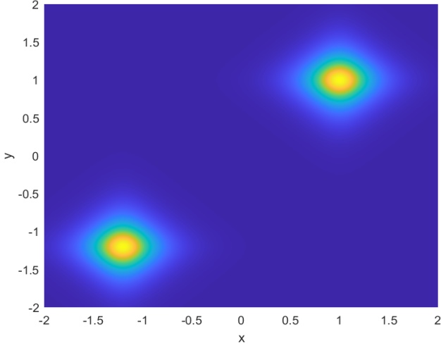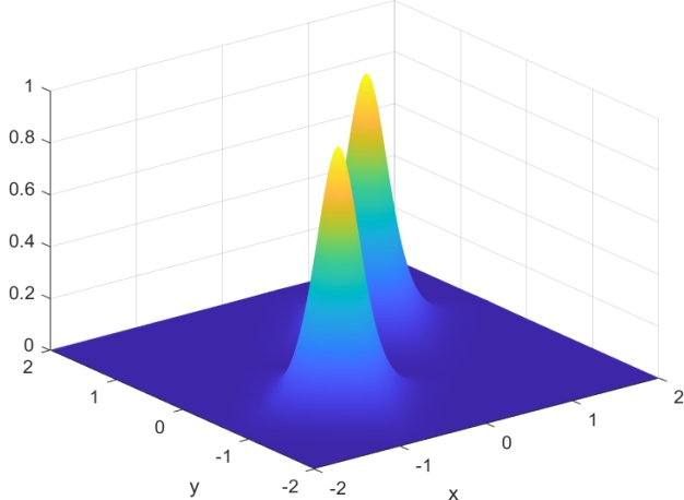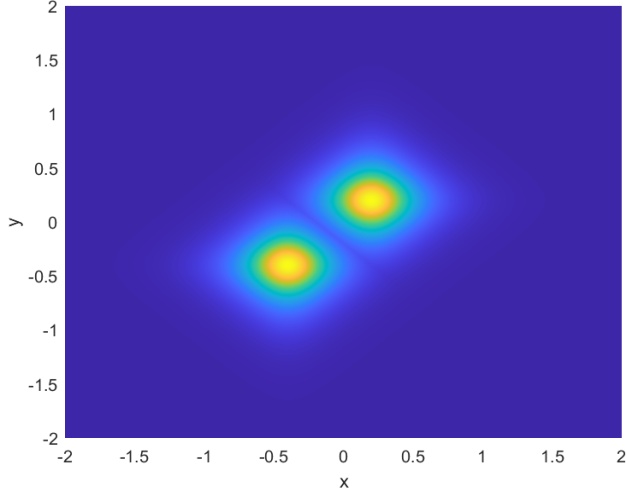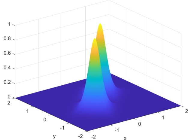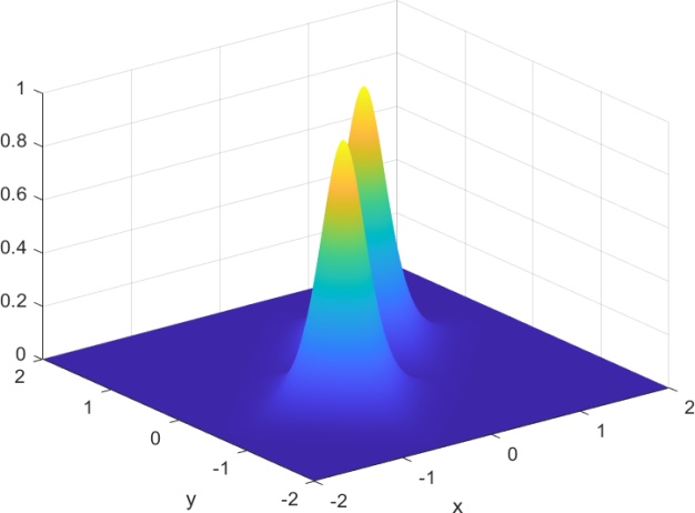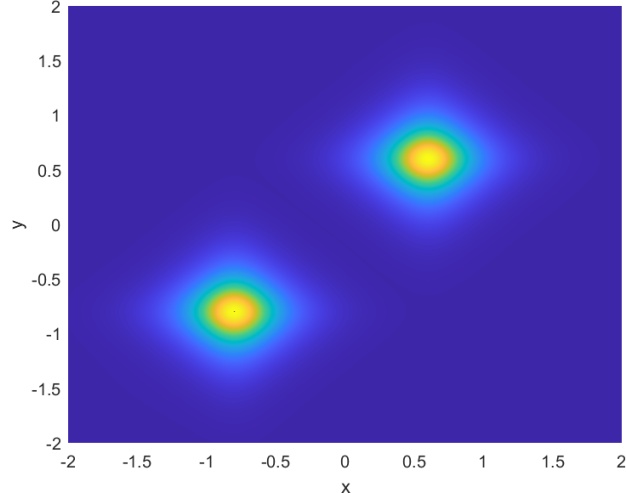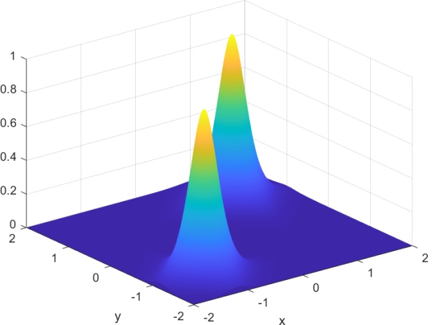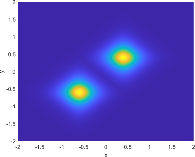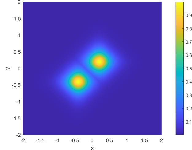 本节的目标是利用我们的方法模拟两个空间上偏移的二维矢量亮孤子在二维空间中的传播过程,全面展示其从初始形成到稳定传播的演化全过程。实验中,我们引入具有正非线性系数的二维非线性薛定谔方程作为基础模型,通过调控初始波包的幅度与宽度,构造出符合稳定传播条件的亮孤子。随后,通过数值模拟观察亮孤子在自由传播过程中是否能够保持结构稳定,避免扩散或塌缩。为了构造两个孤子的传播模拟,由方程(1.1)中