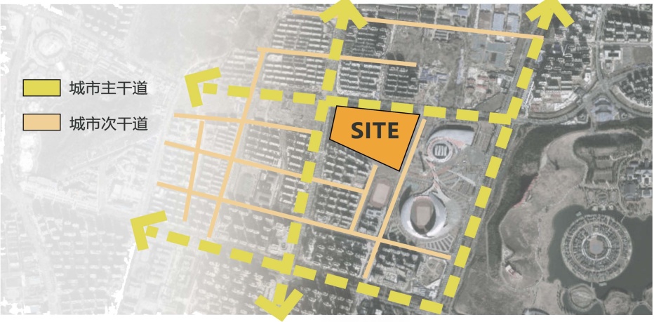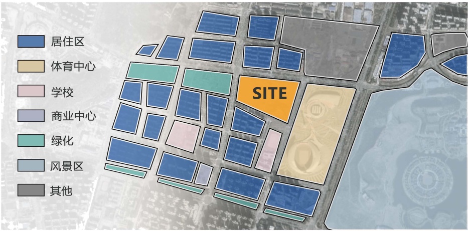 经实地调研考察,本设计选址于蚌埠市奥林匹克体育中心附近的空地,该场地占地面积约14公顷,平面略近梯形,毗邻体育中心、住宅区与学校,接近龙子湖风景区。