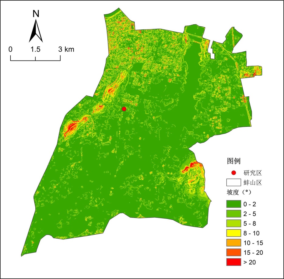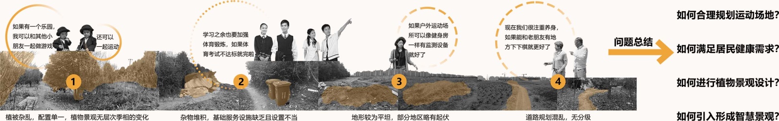 通过GIS软件进行该场地发高程、坡度与坡向分析,发现该场地整体地势平缓,高程在8~160米之间。大部分区域坡度在5度以下,适宜建设。坡向以南向和东南向为主,日照条件优越,利于开展户外活动(图2)。根据实地勘察发现,地形整体较为平整,略有起伏,存在少量堆方;植物生长杂乱,层次模糊,种类单一;整体环境中垃圾堆积,污染城市环境;道路混乱,无分级(图3)。